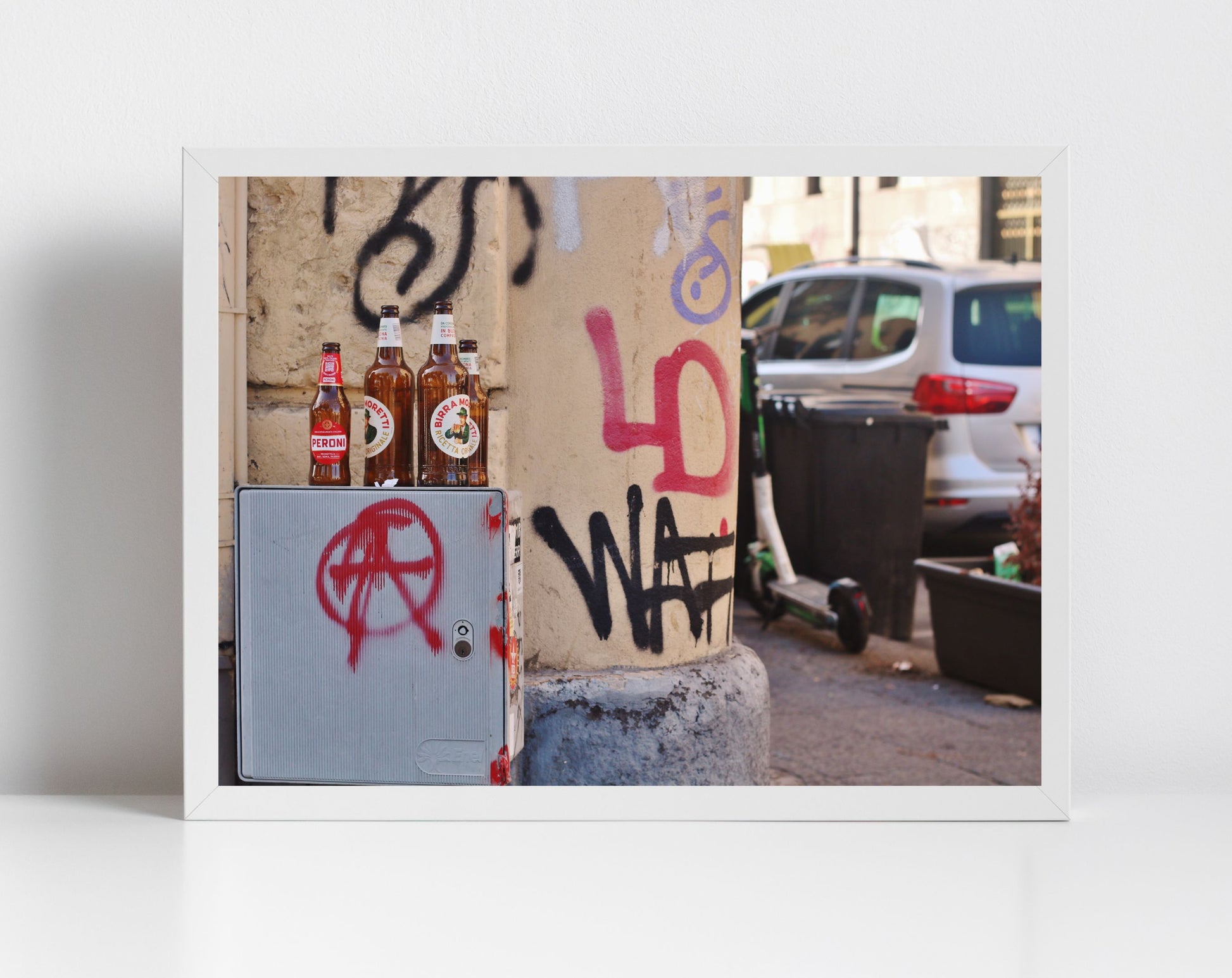 A gritty street corner of anarchist graffiti and empty beer bottles in the Sicilian city of Catania.