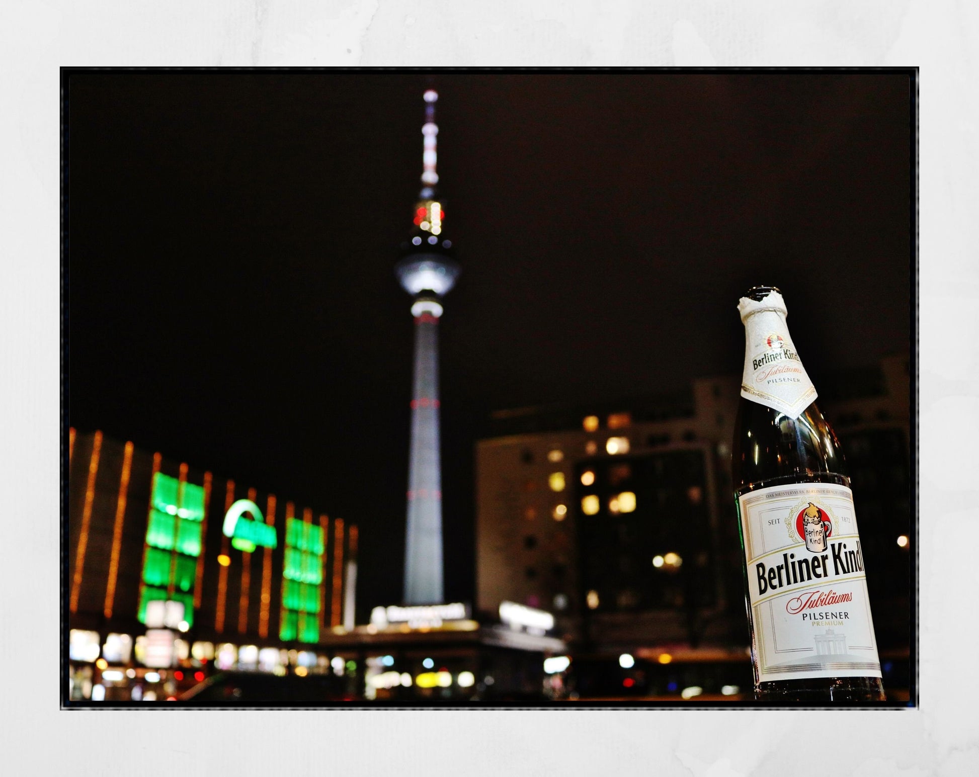Berliner Kindl beer in front of the city's TV Tower.