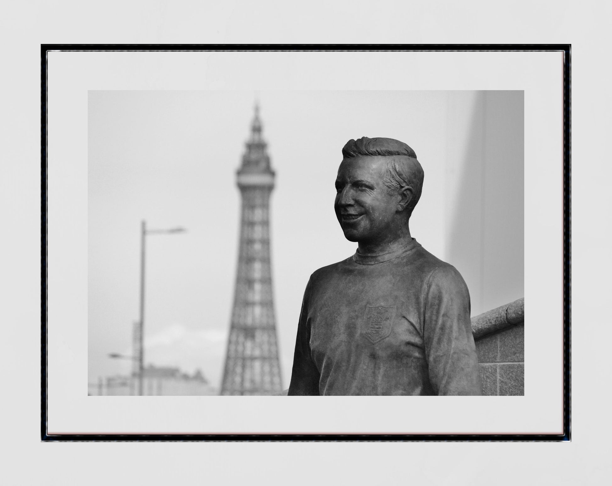 This black and white photography print shows the statue of legendary Blackpool player Jimmy Armfield at Blackpool Football Club Stadium. It is available in a variety of sizes, from small to extra large, and is striking displayed on its own or as part of a gallery wall.