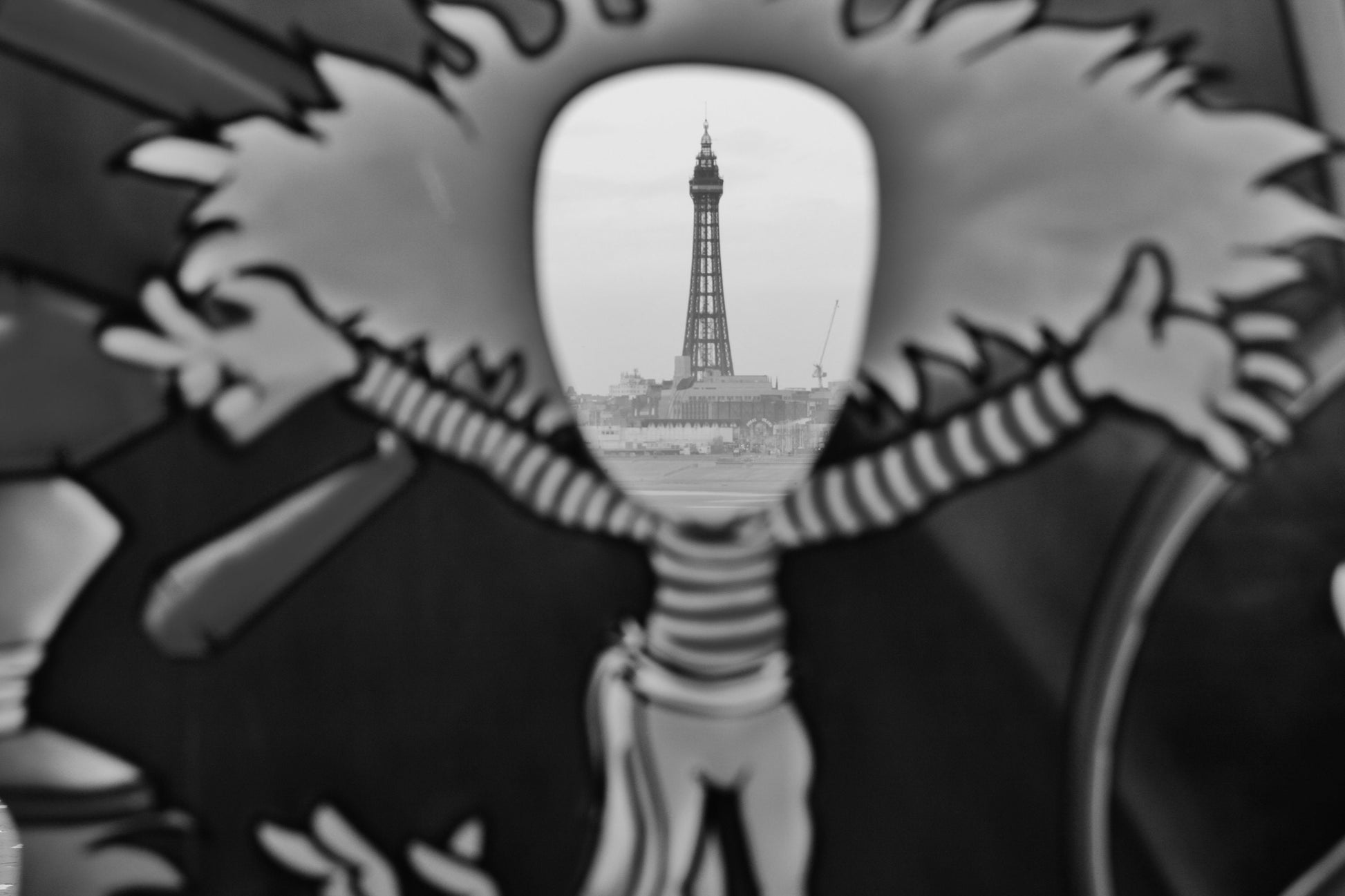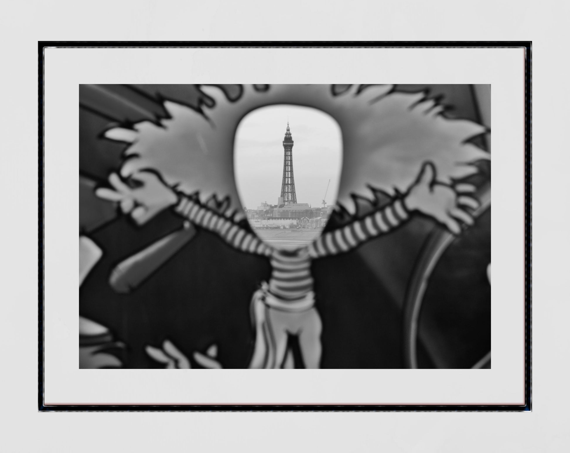 This black and white photography print shows Blackpool Tower framed by a cut out on South Pier. It is available in a variety of sizes, from small to extra large, and is striking displayed on its own or as part of a gallery wall.