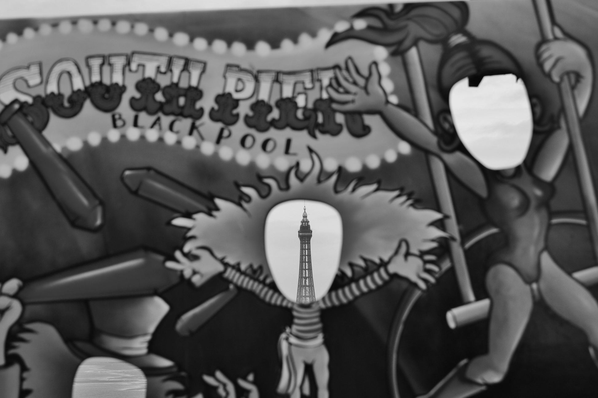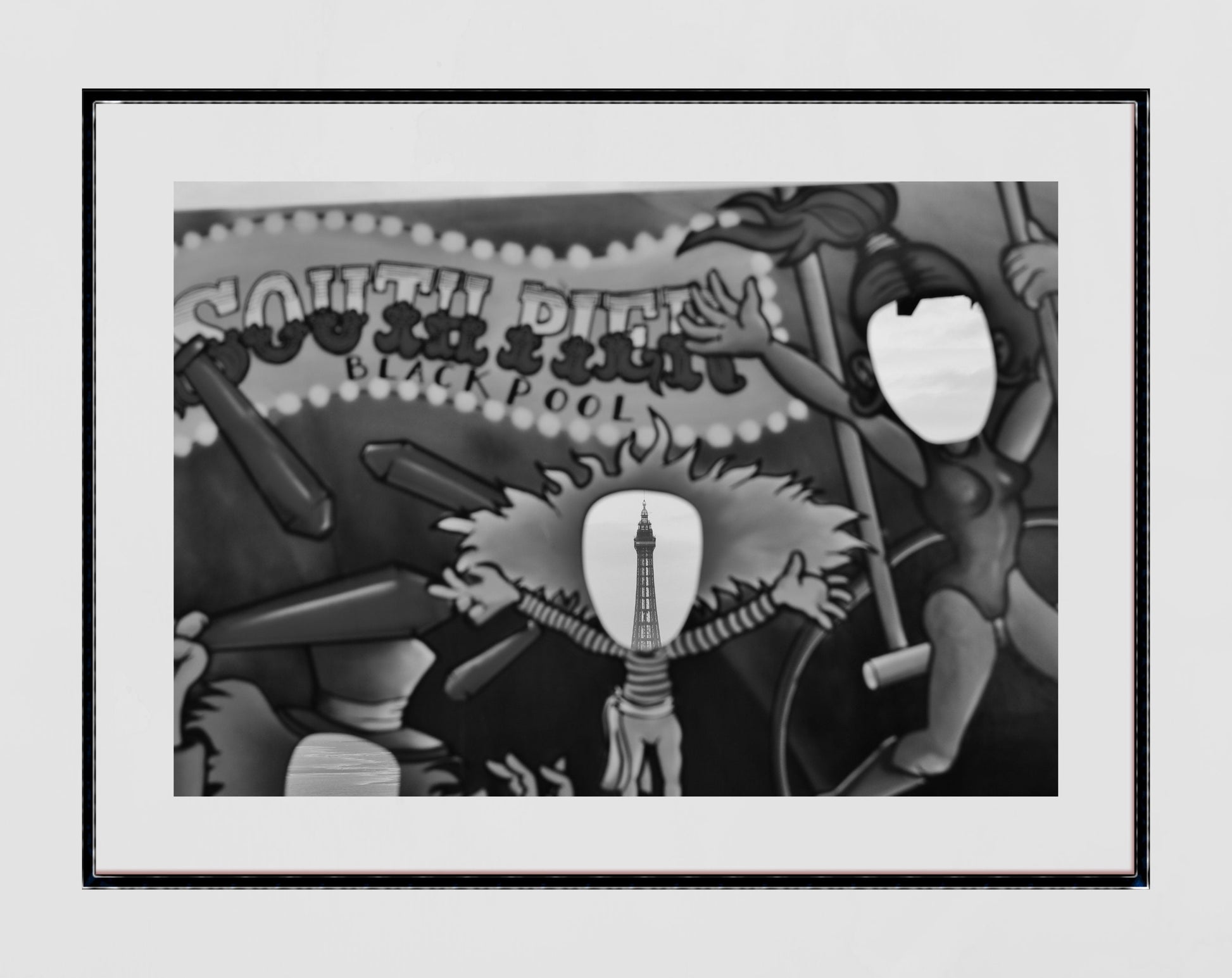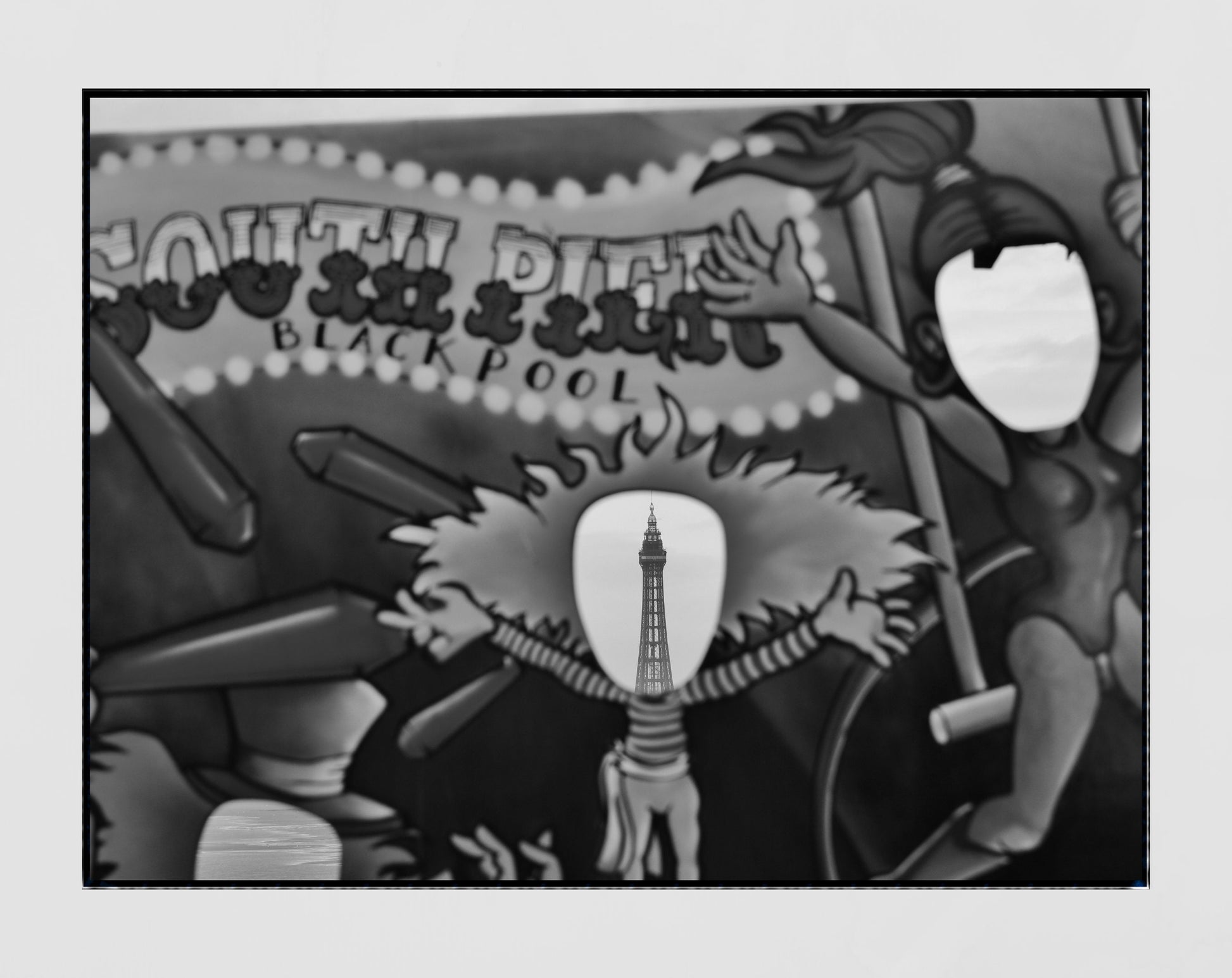 This black and white photography print shows Blackpool Tower framed by a cut out on South Pier. It is available in a variety of sizes, from small to extra large, and is striking displayed on its own or as part of a gallery wall.