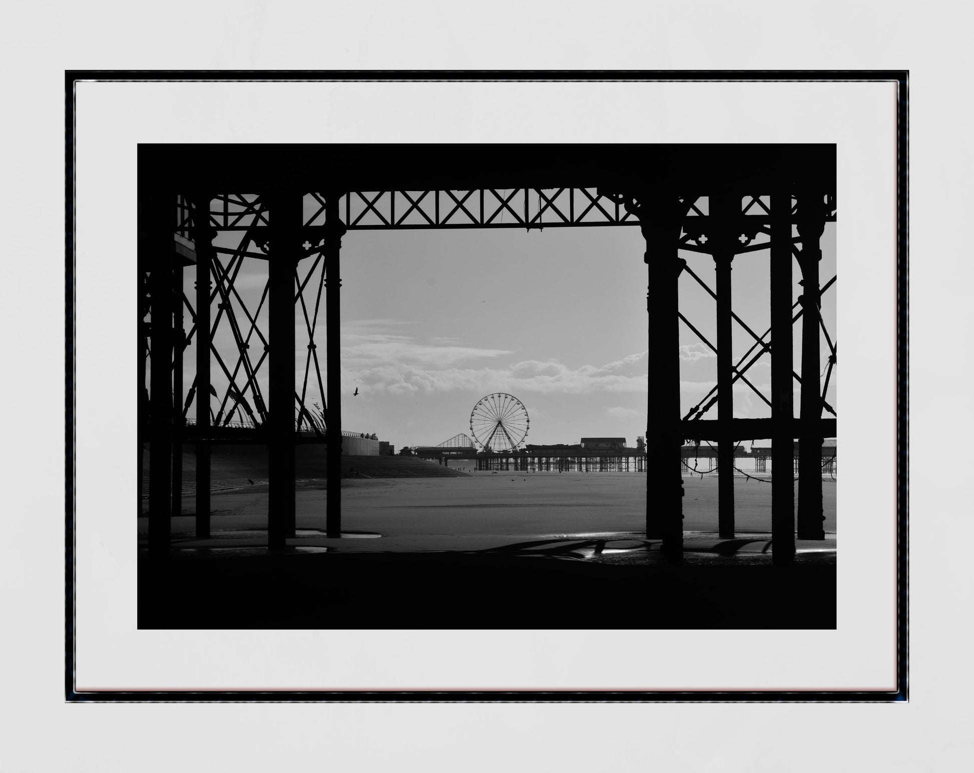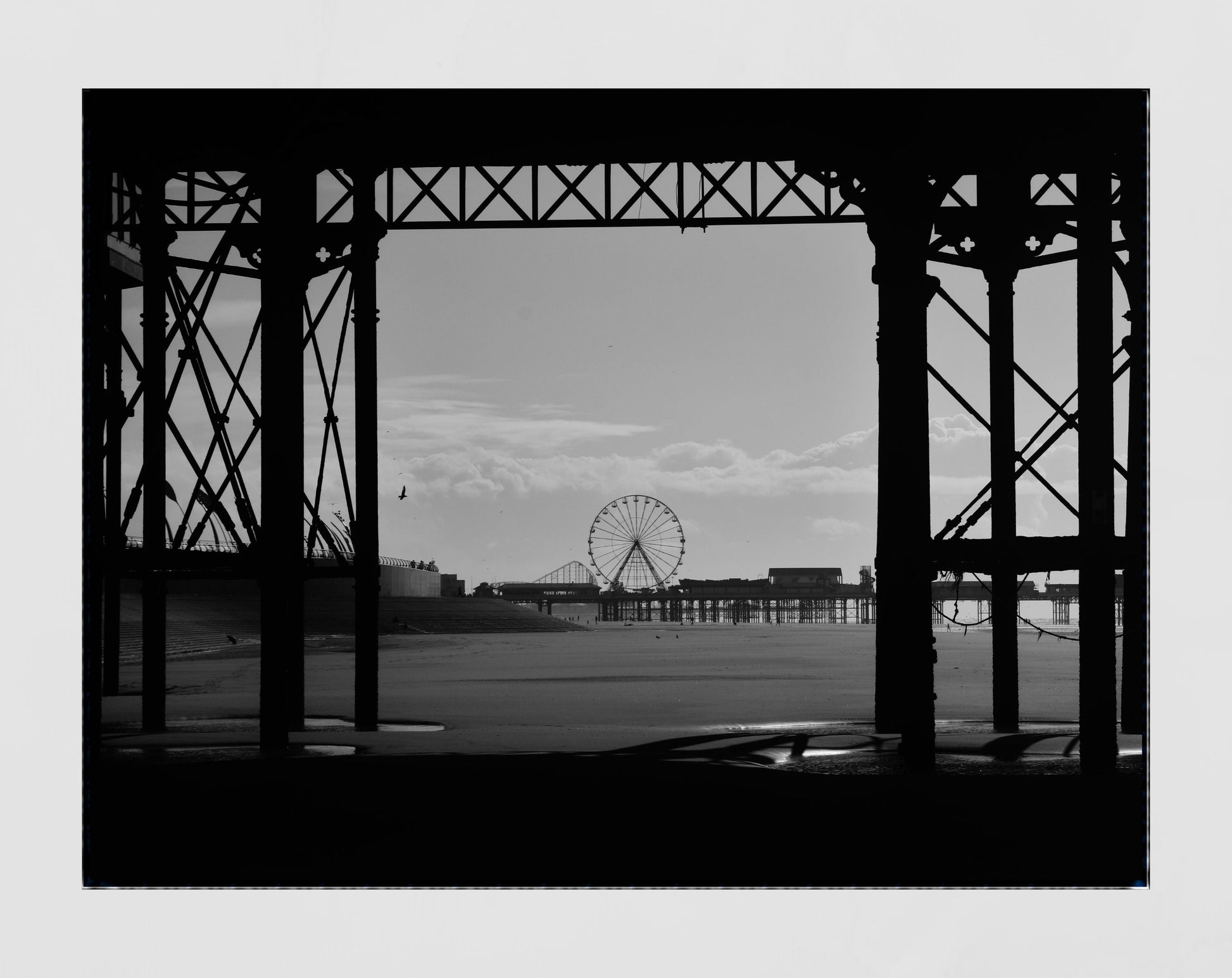 A walk along the beach of the iconic seaside town of Blackpool means walking under the boardwalk, the impressive structure of the pier towering above. This black and white photograph was taken under North Pier with the outline of Central Pier seen in the distance.