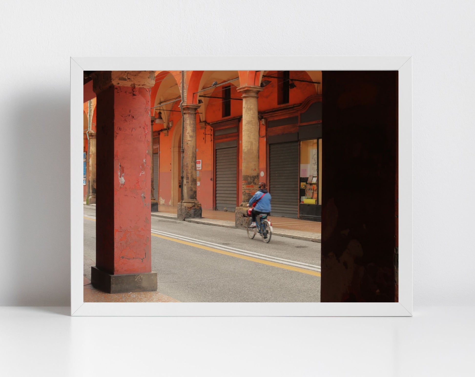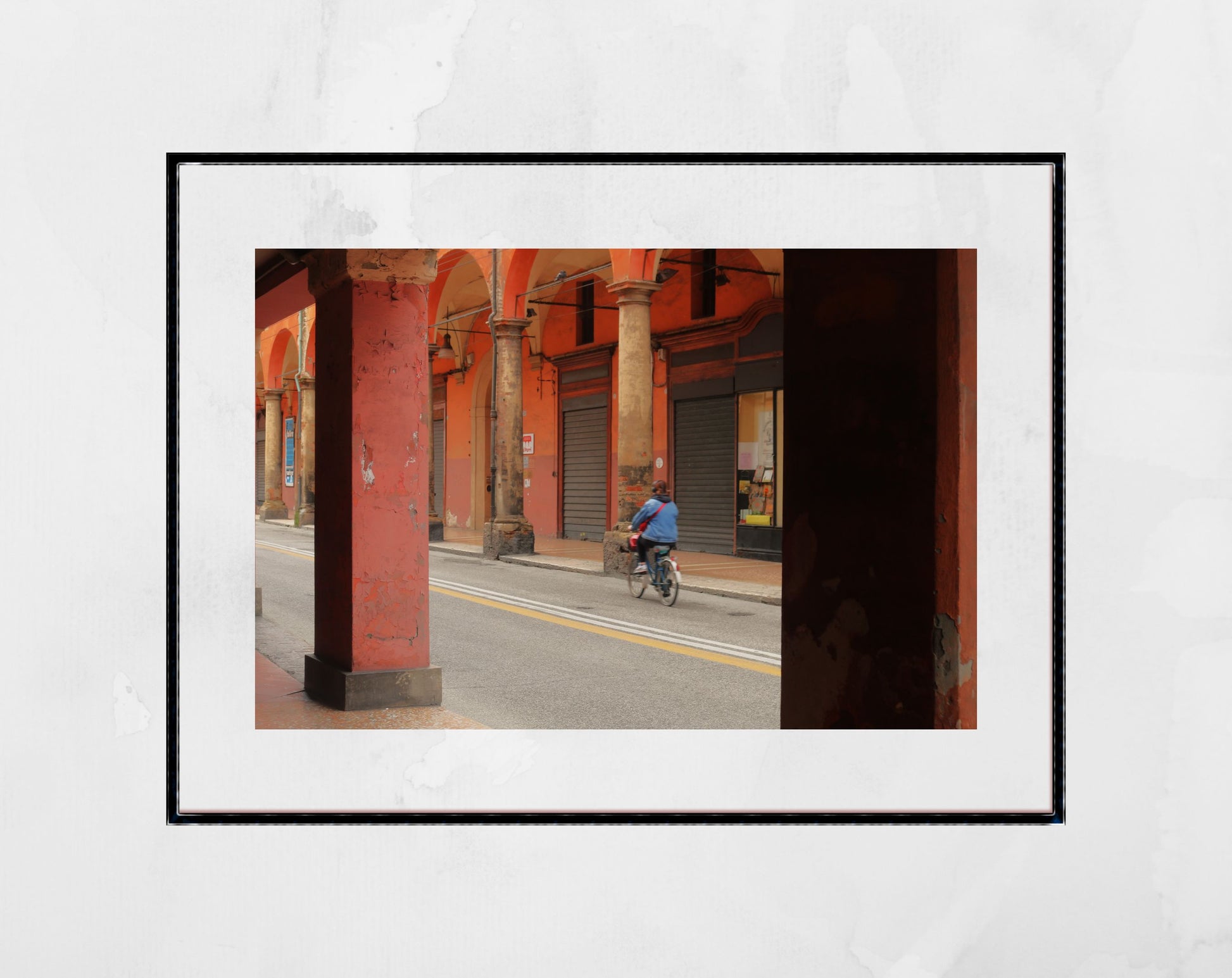 Porticos, covered walkways lined with columns, are an architecturally defining feature of Italy's Bologna. We took this photograph while strolling through a portico in the city centre as a cyclist made its way past.