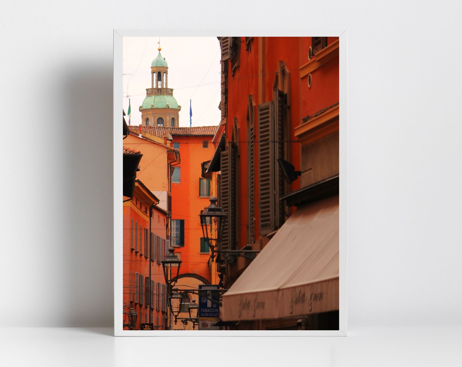 Via d'Azeglio, a narrow street in the centre of Bologna, with burnt orange buildings, shuttered windows, and Torre dell'Orologio (Clock Tower) in the distance.