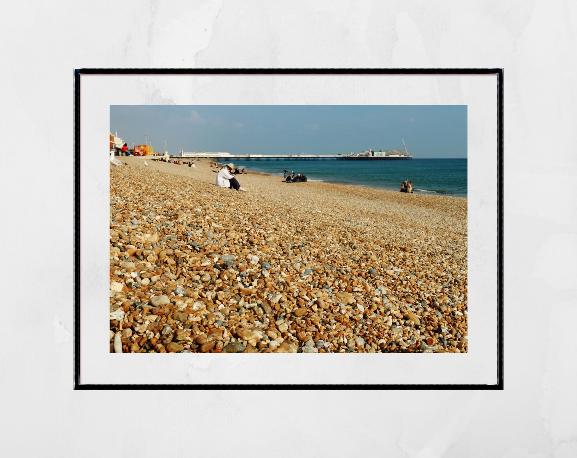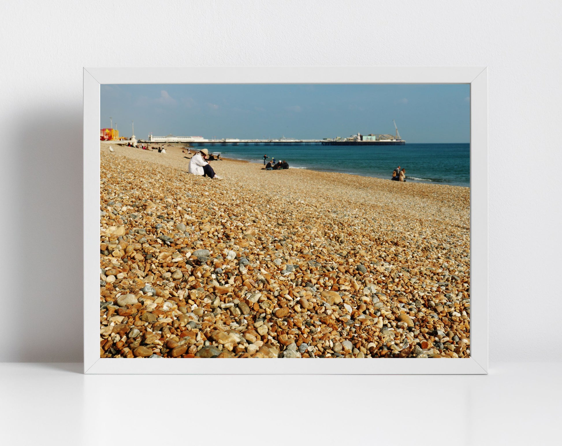 Atop Brighton Palace Pier sits helter skelters, rollercoasters and funfair rides. This photography print shows the pier's swirling skyline from the city's pebble beach.