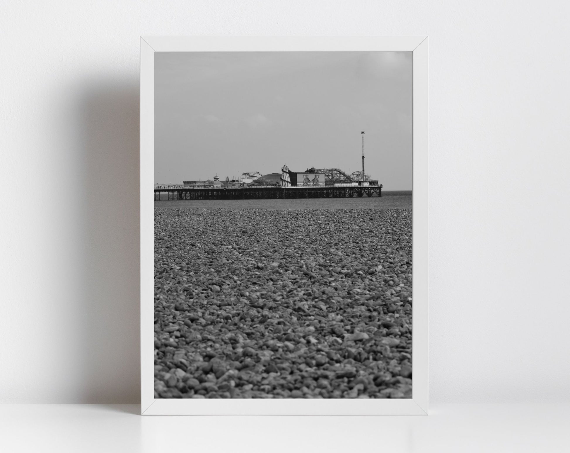 Atop Brighton Palace Pier sits helter skelters, rollercoasters and funfair rides. This photography print shows the pier's swirling skyline from the city's pebble beach.