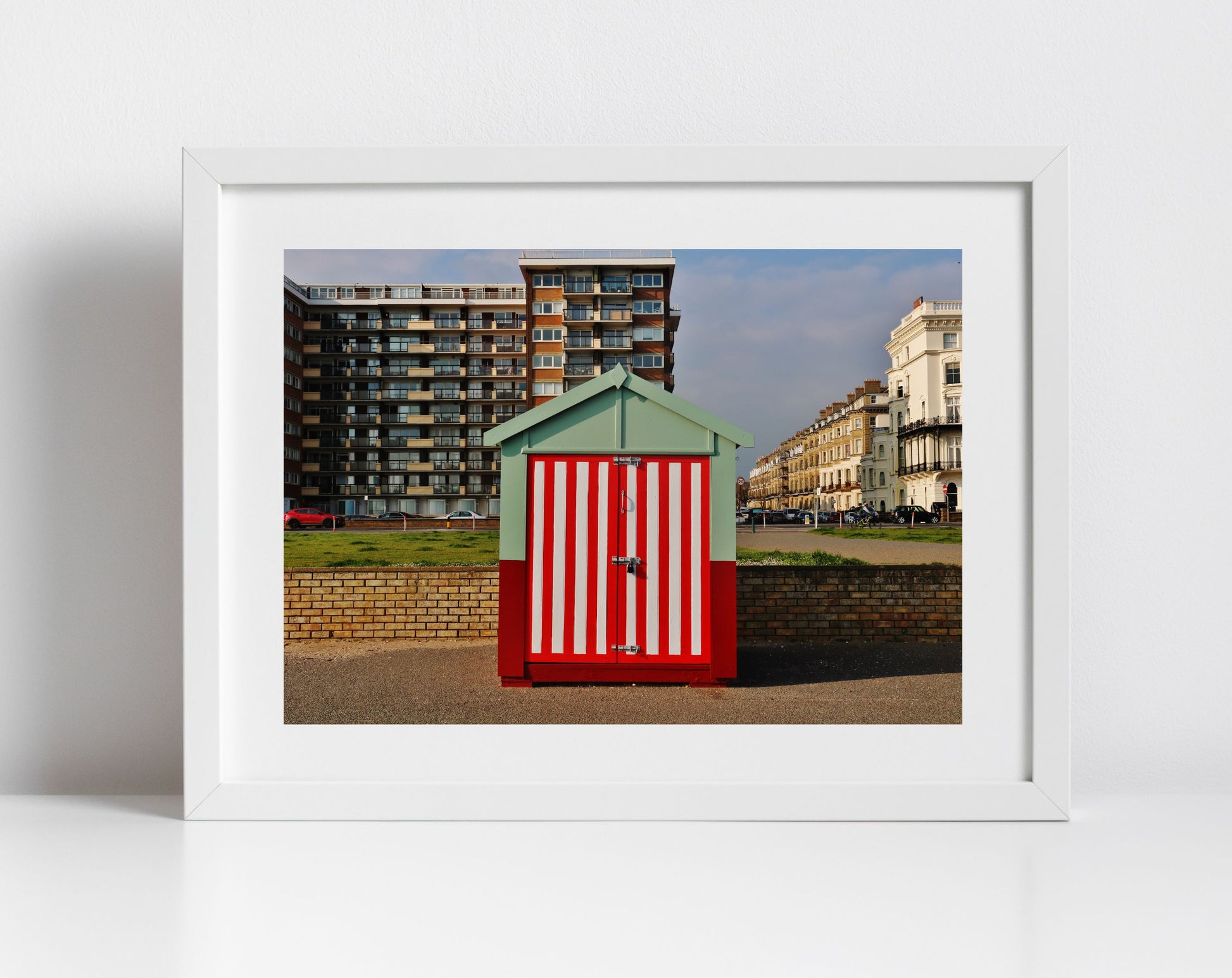 This Brighton photography print shows the candy coloured beach huts at Hove, an iconic landmark in the British seaside city.