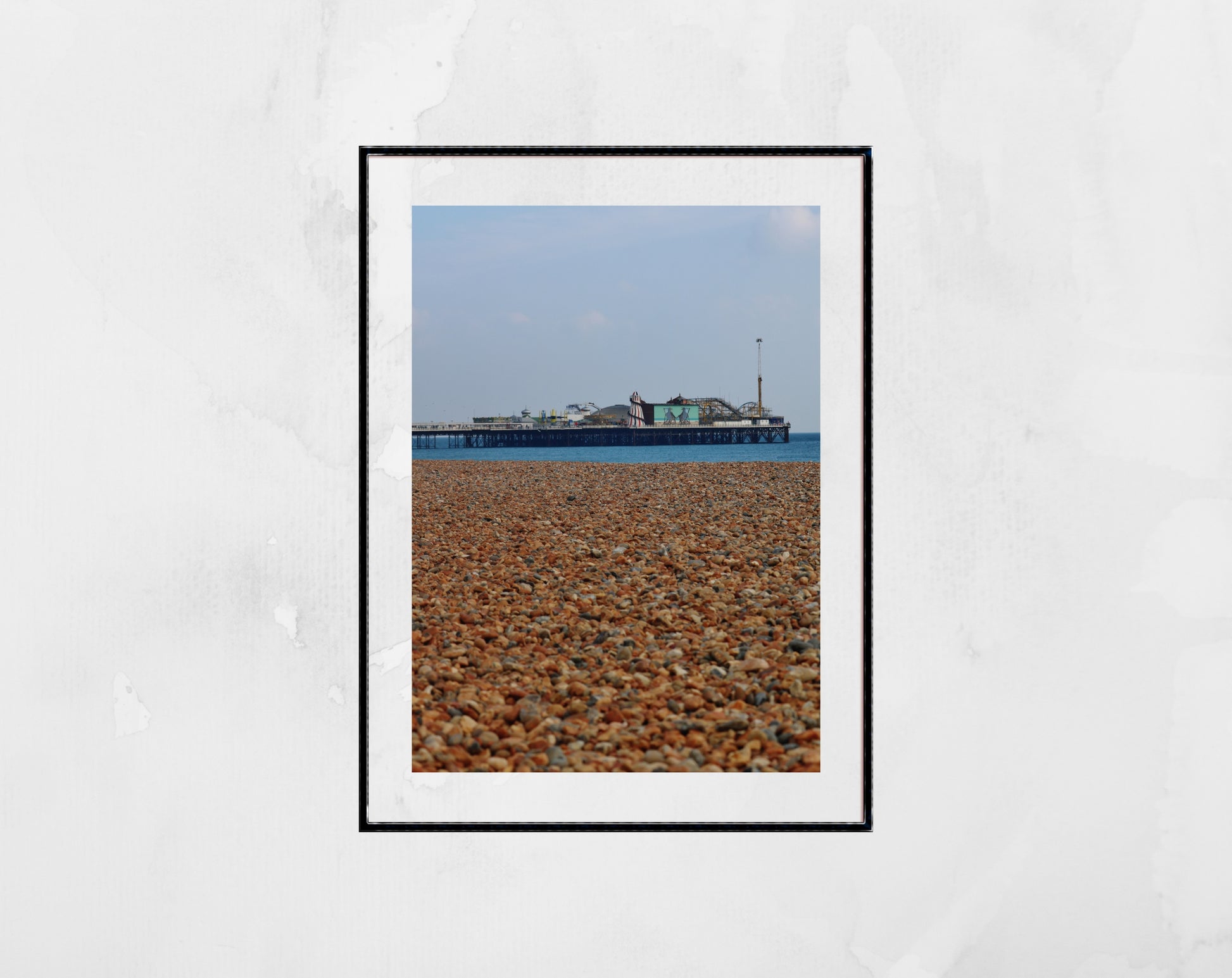 Atop Brighton Palace Pier sits helter skelters, rollercoasters and funfair rides. This photography print shows the pier's swirling skyline from the city's pebble beach.