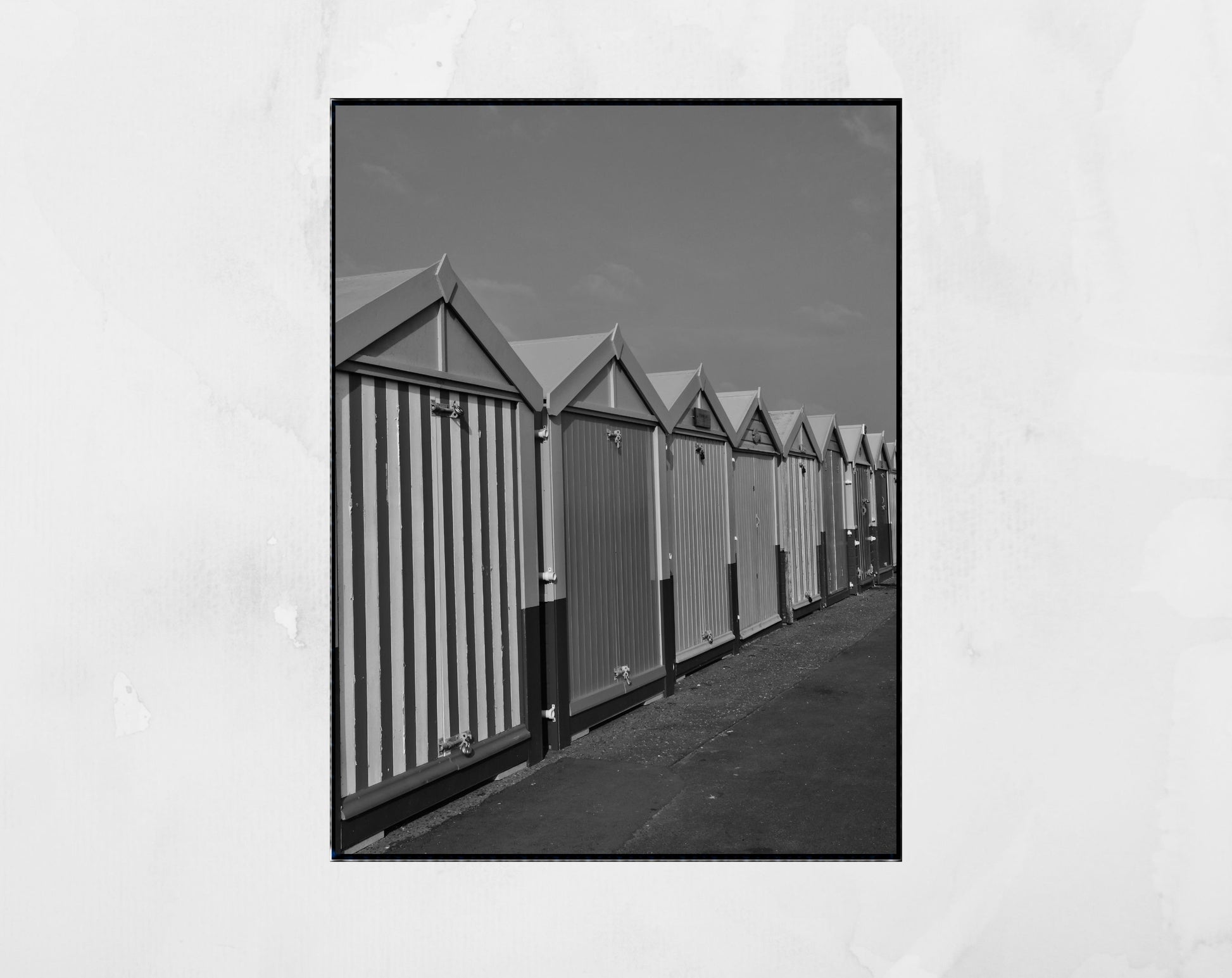 This Brighton photography print shows the candy coloured row of beach huts at Hove, an iconic landmark in the British seaside city.