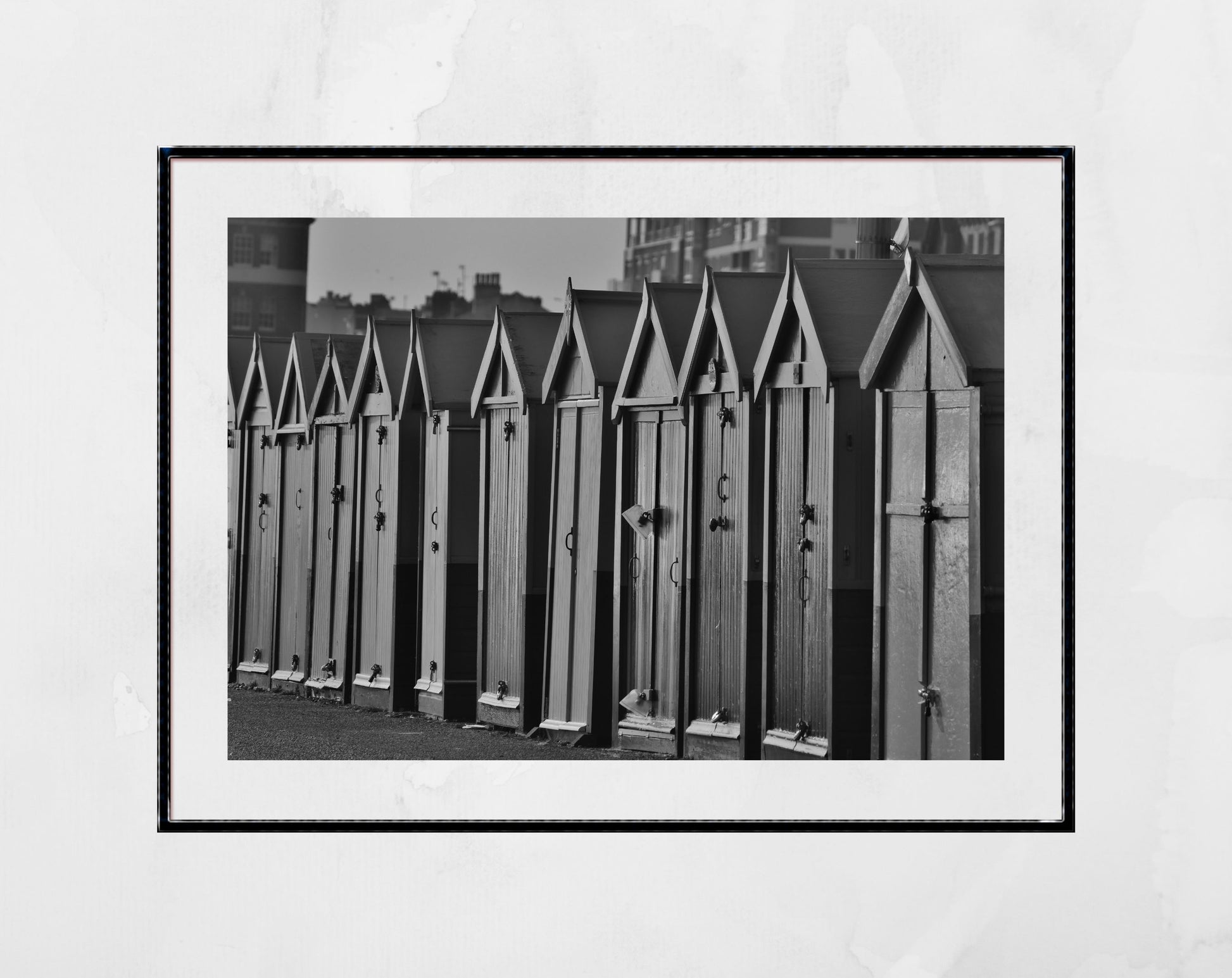 This black and white Brighton print shows the row of beach huts at Hove, an iconic landmark in the British seaside city.