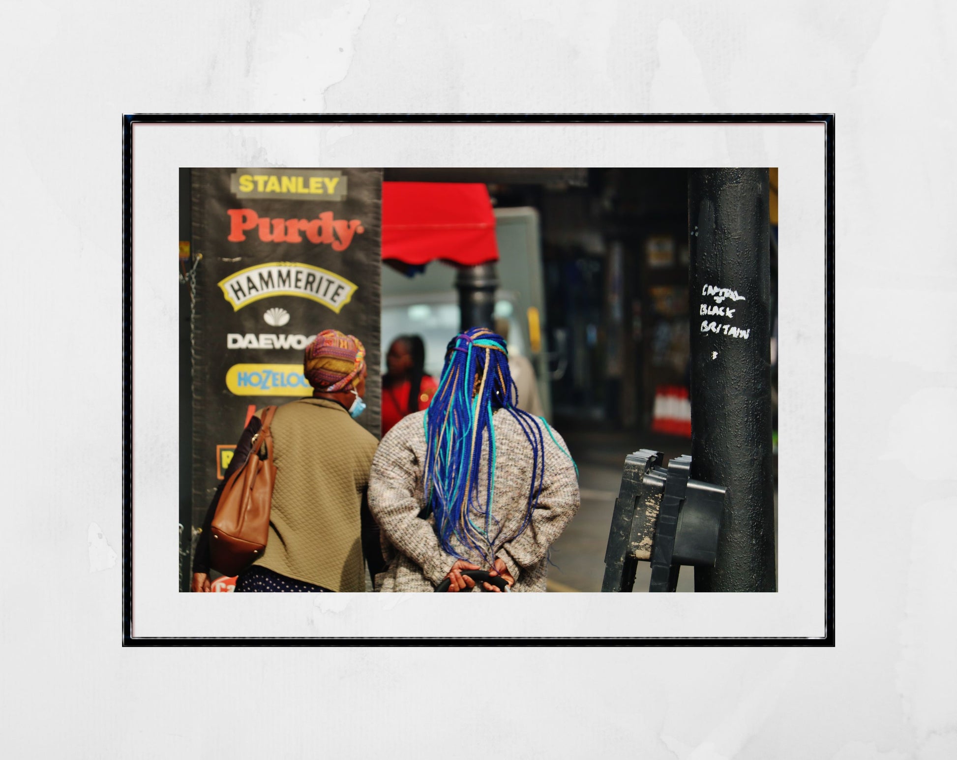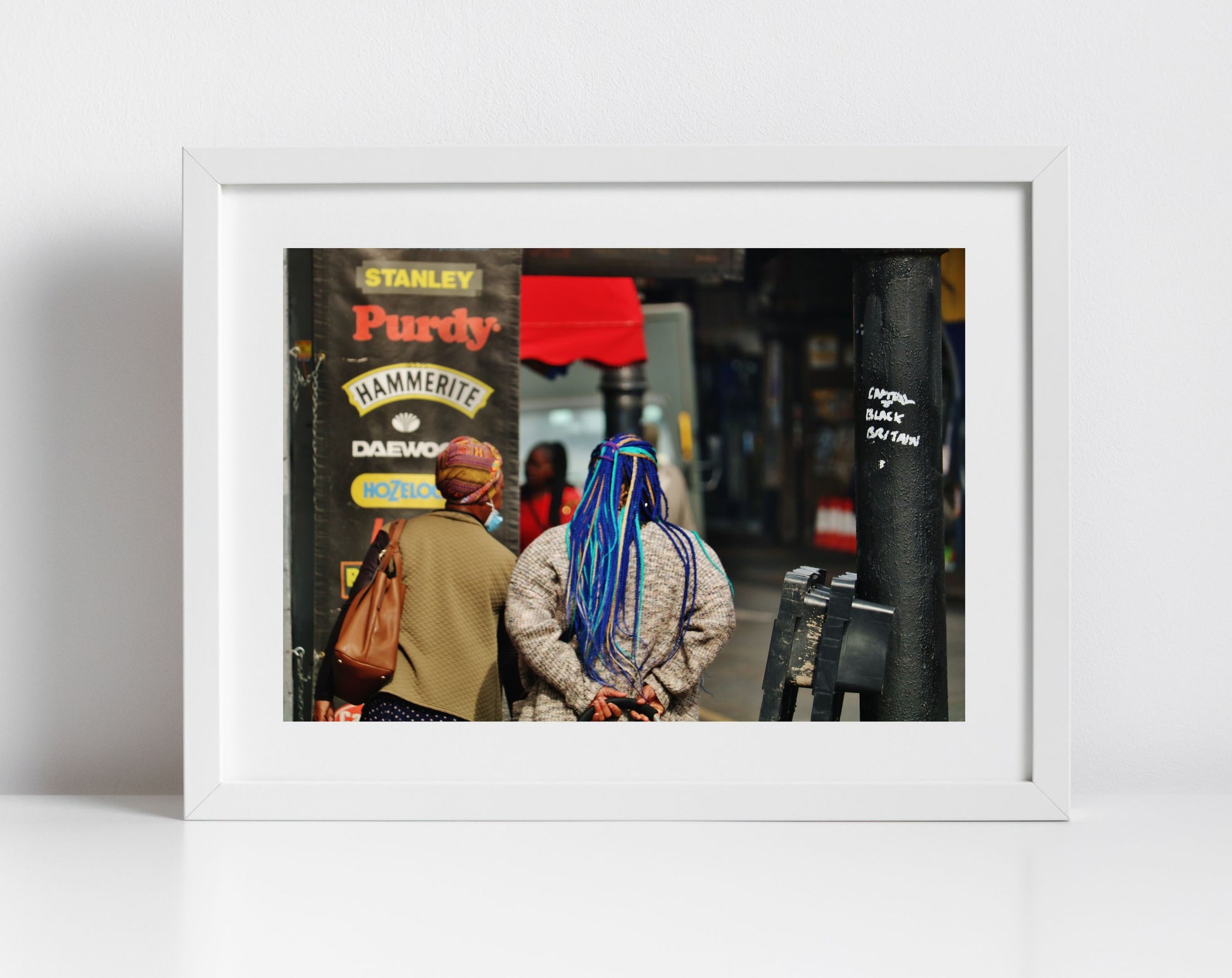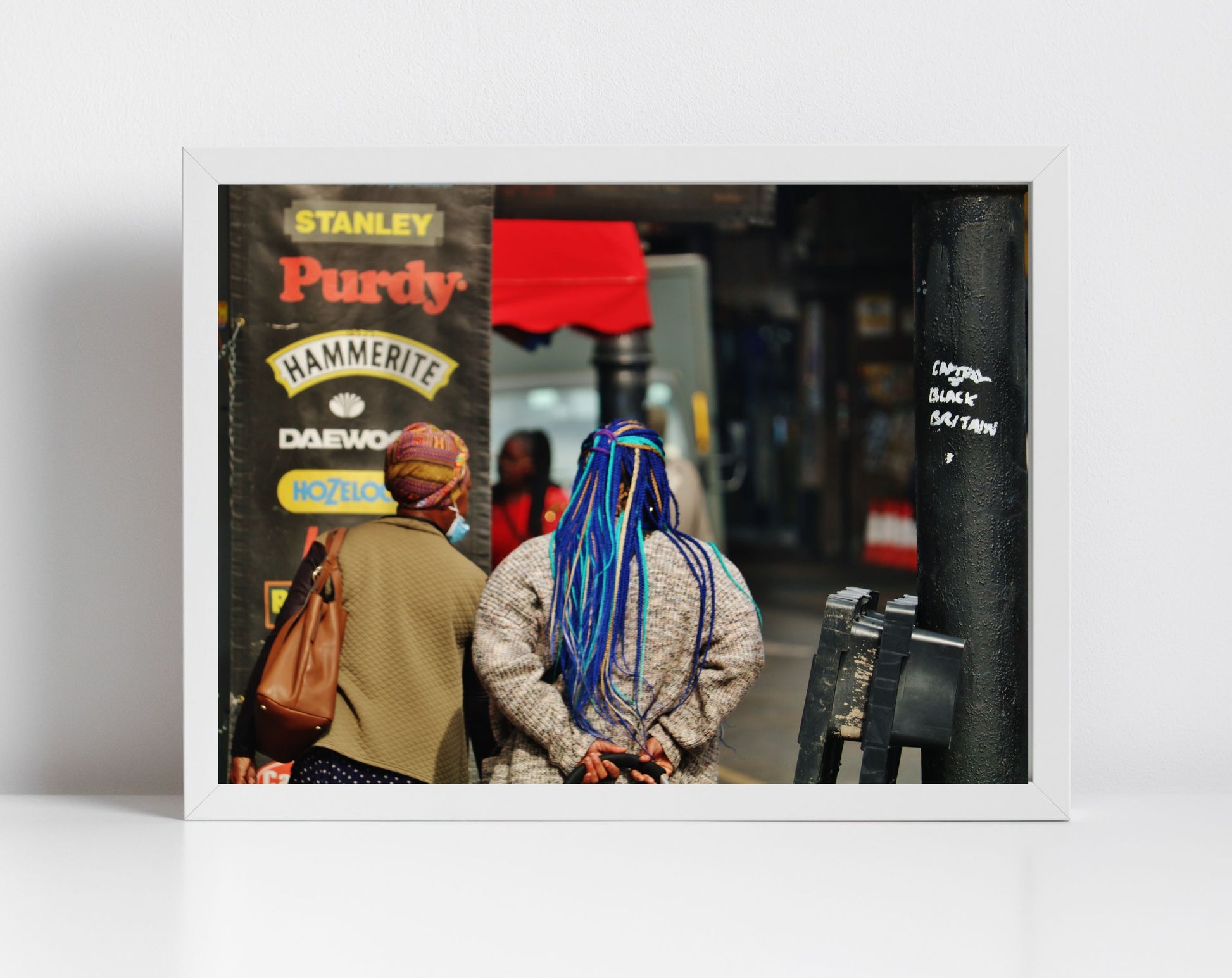 Brixton is London's Afro-Caribbean cultural epicentre, home to shops and market stalls selling drinks, fabrics and produce sourced from West Africa and the Caribbean isles. This shows two people walking along he neighbourhood's Atlantic Road with "Capital of Black Britain" scrawled on the lampost.