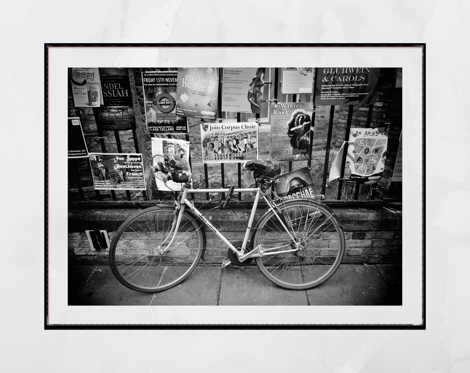 A slice of life in the UK town of Cambridge; a bicycle (the most popular way to get around) resting against a fence covered in university posters.