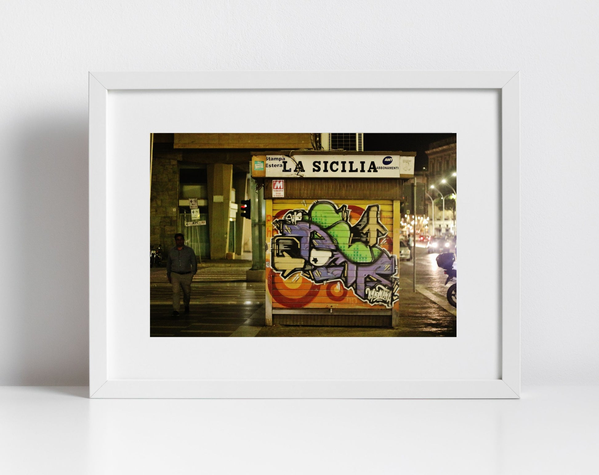 A graffiti covered kiosk in Catania, Sicily, at night.