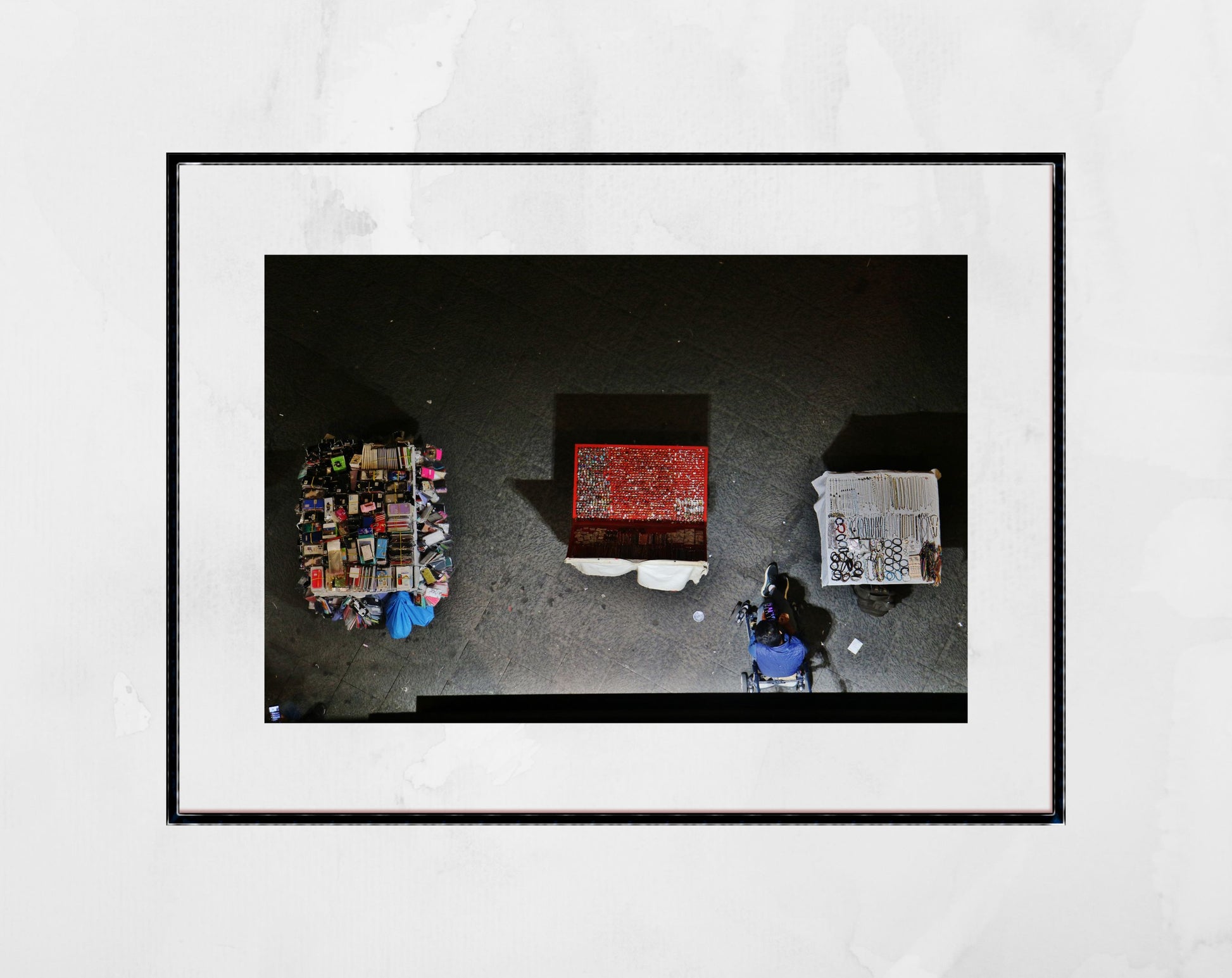 As night falls in Catania, Sicily, a street trader sets up stalls selling trinkets.