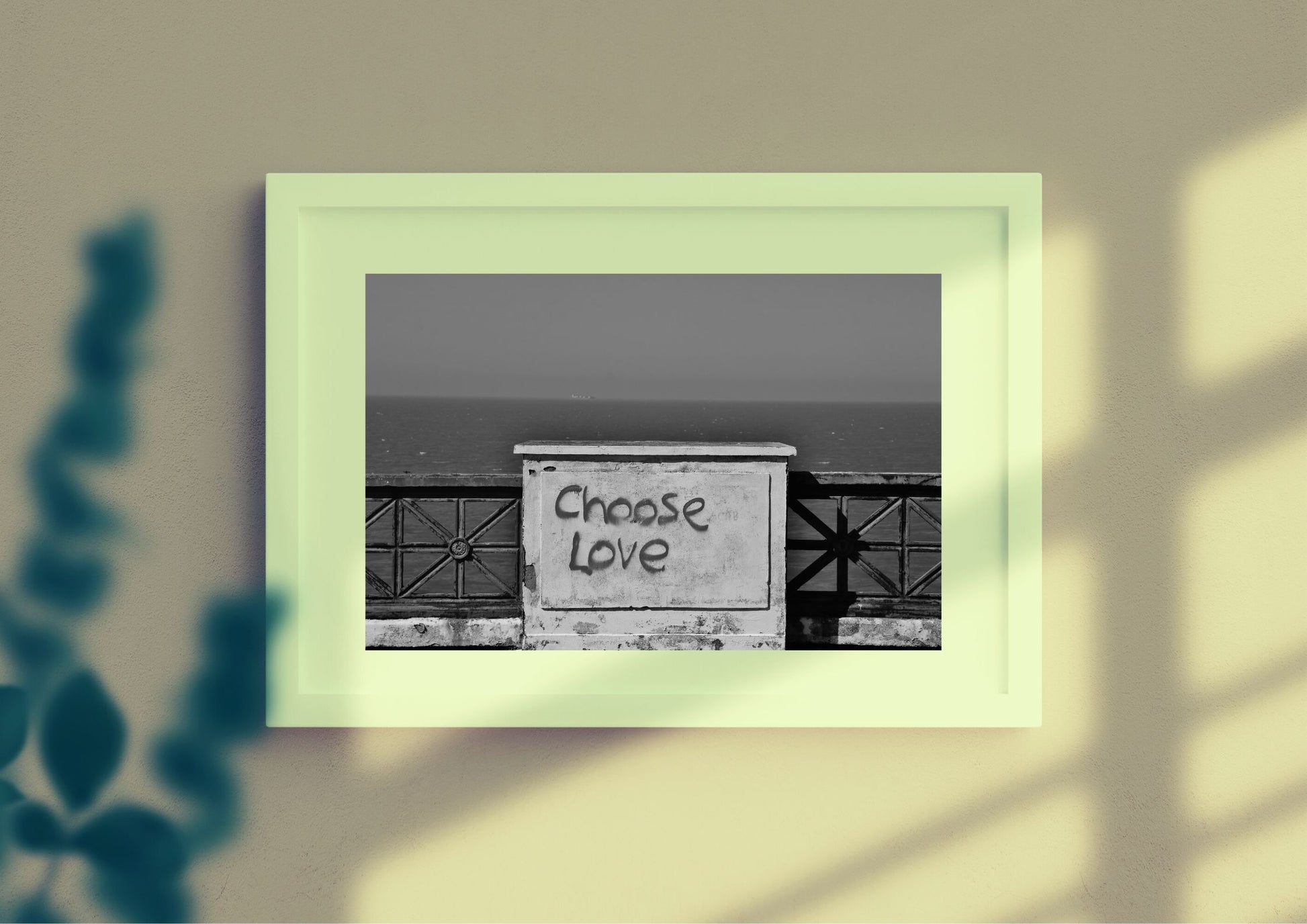 Margate is one of the UK's most iconic seaside towns. Formally a destination for British holiday-makers drawn by the funfair rides and sweet sticky rock, it has morphed into a destination of cutting edge cool, home to contemporary art galleries and rock-star owned hotels. This black and white photography print shows graffiti at the town's beach instructing those who see it to "choose love."