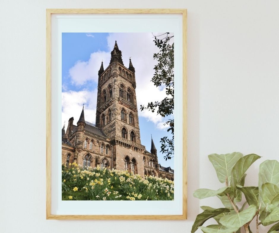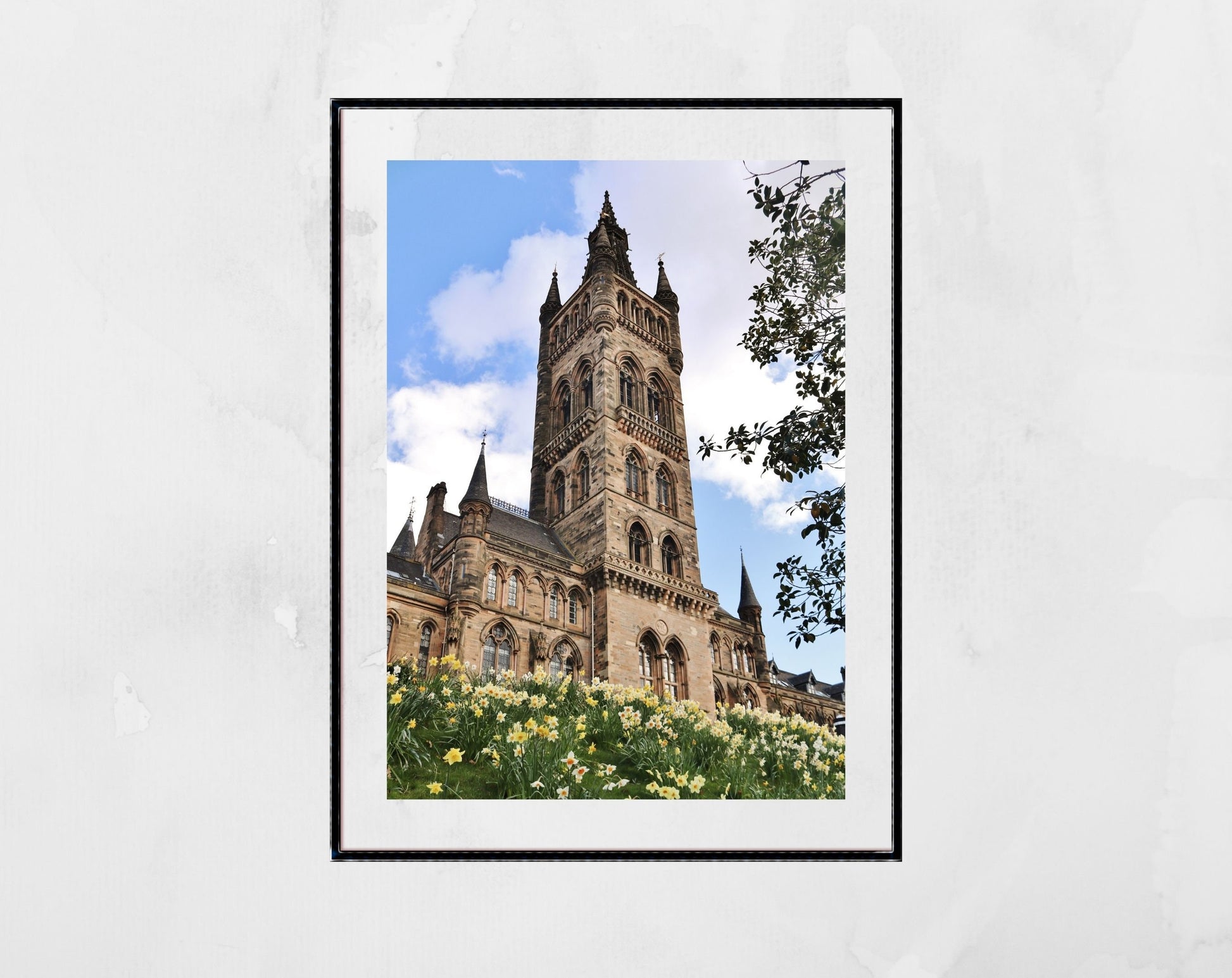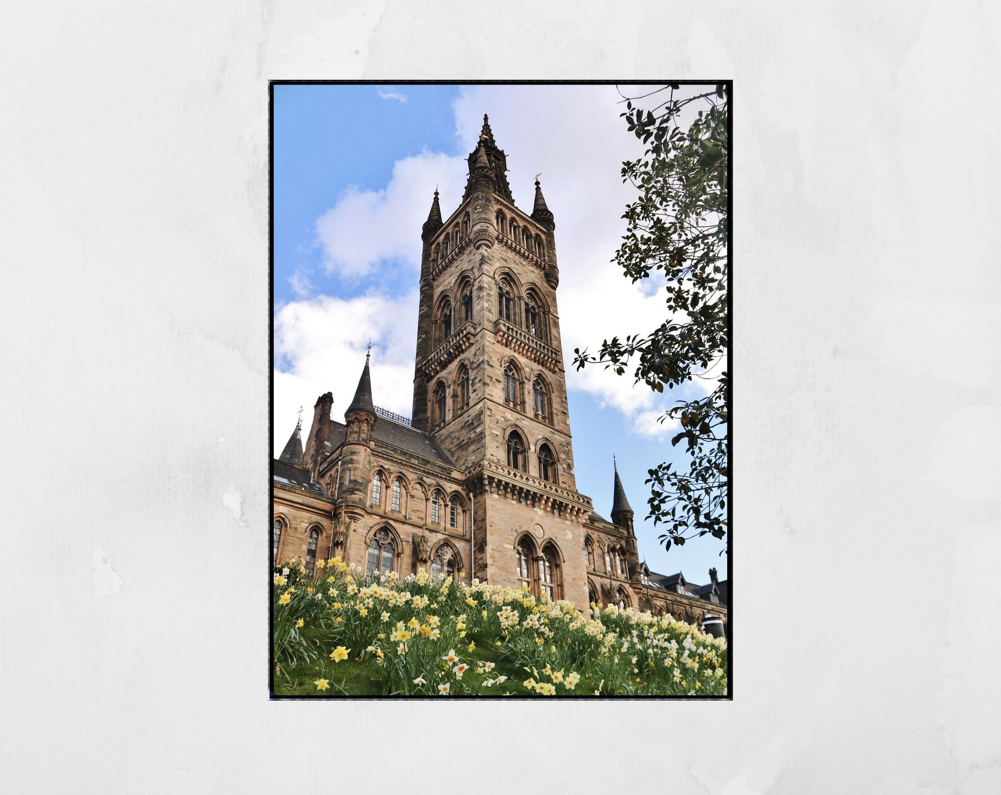 A blanket of daffodils unfolds from Glasgow University's gothic tower towards Kelvingrove Park as spring flourishes in full bloom.