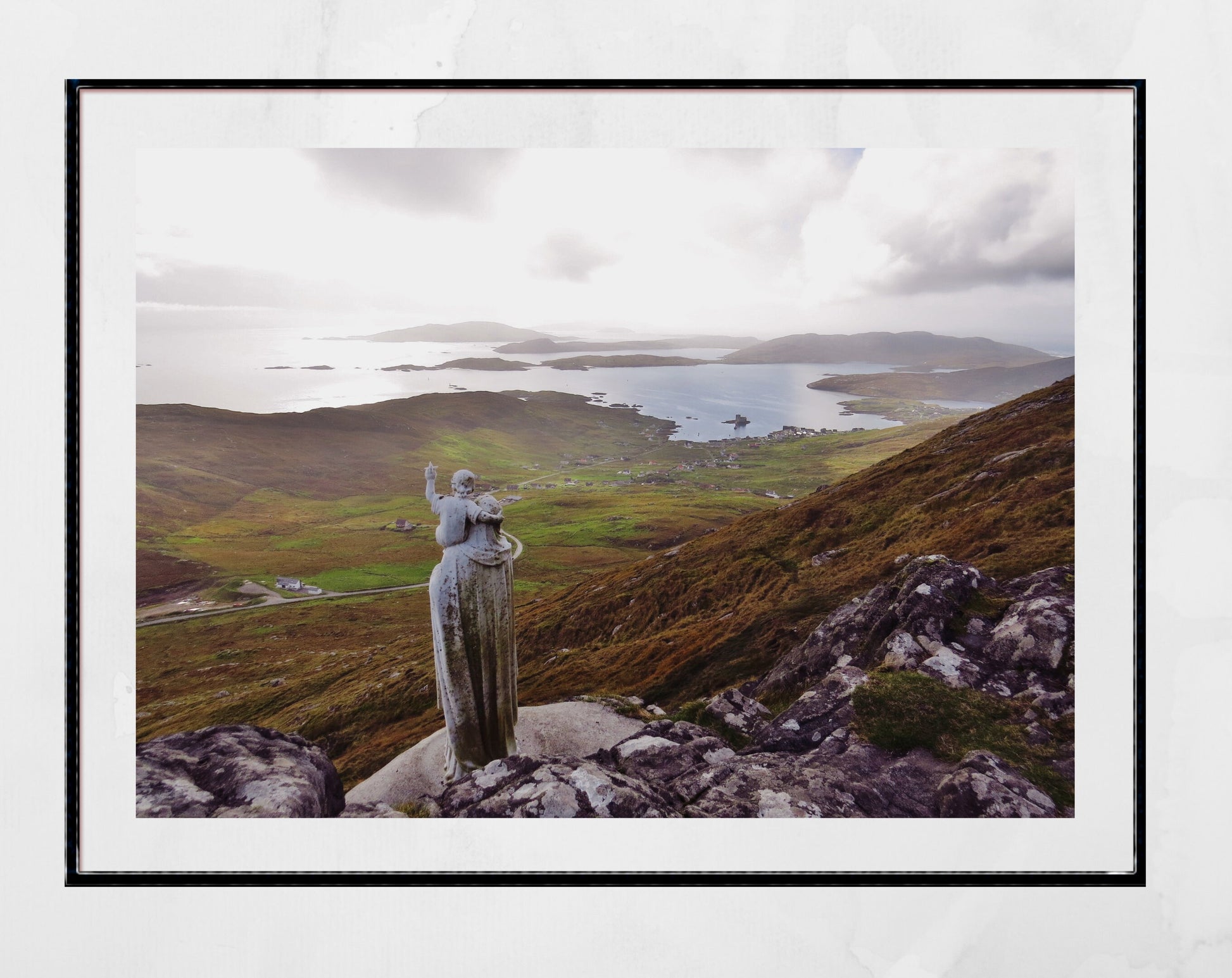 A photo of the Madonna and Child (Our Lady of the Sea) statue in the Isle of Barra in the Outer Hebrides of Scotland and the spectacular view of the surrounding islands.