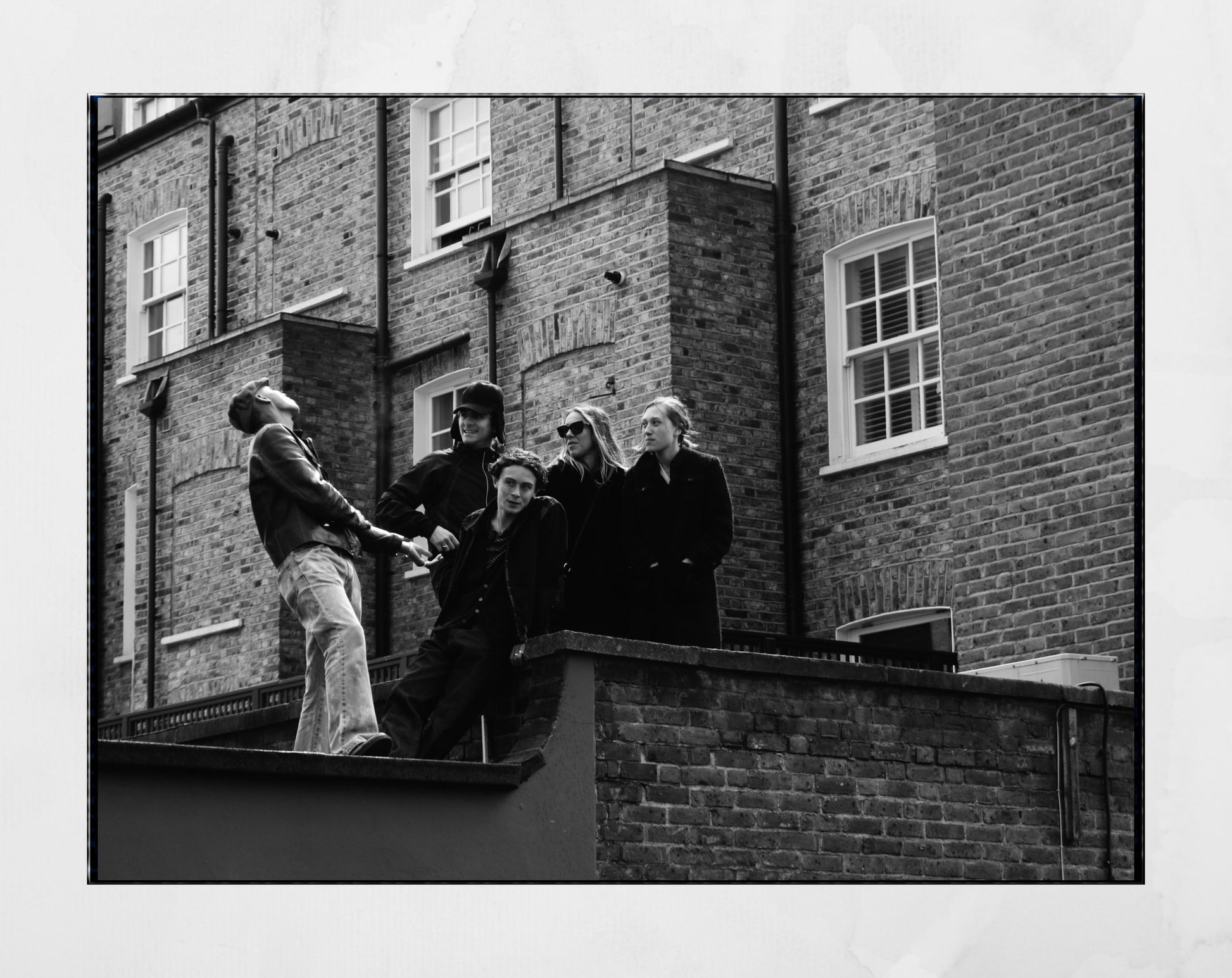 Locals stand on the roof of a flat in Notting Hill, London, to watch the street performances at Rough Trade Records on Record Store Day.
