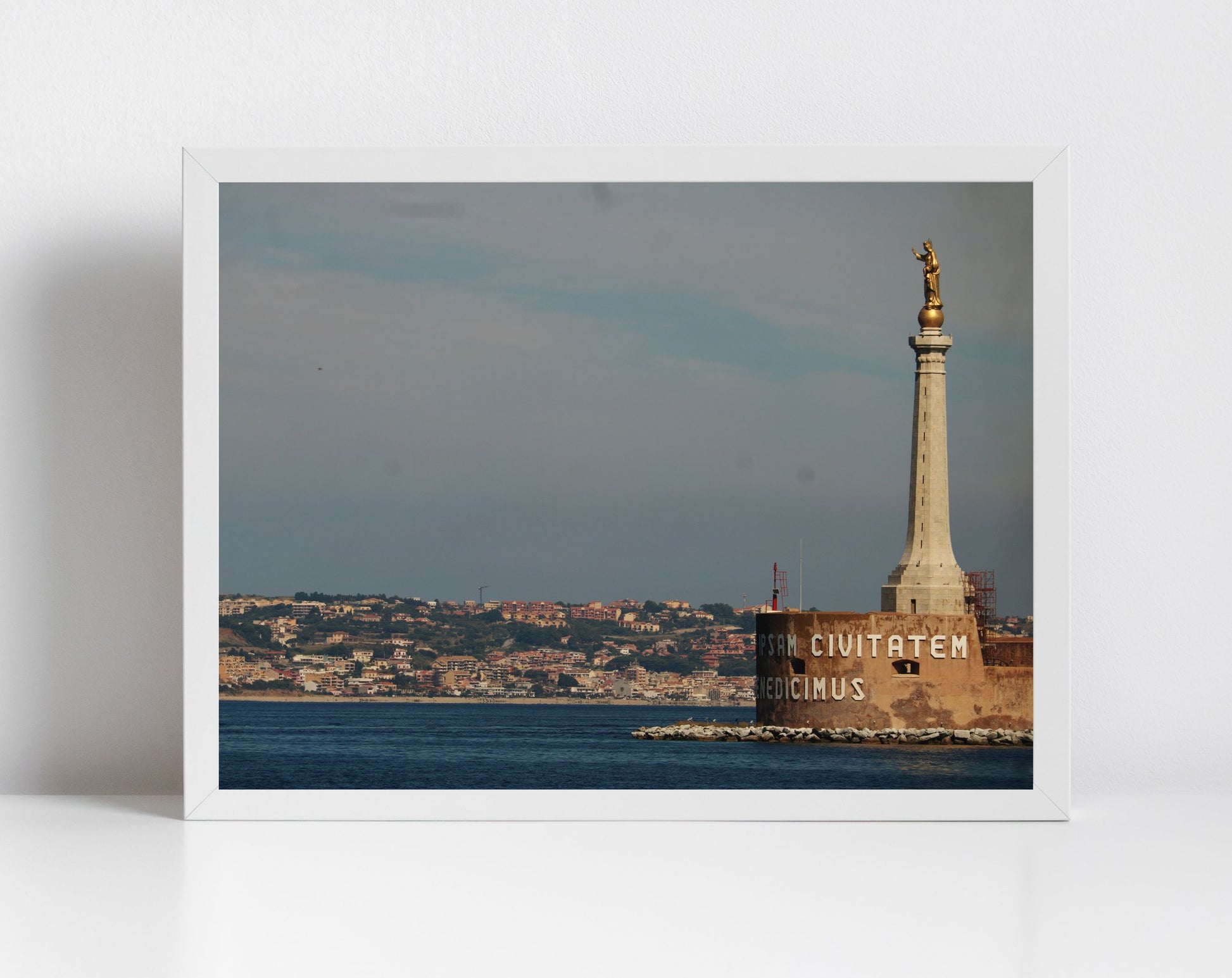 The port of Messina is the main point of entry over sea to Sicily and the statue of Madonna della Lettera at the entrance of the port is often the first sight visitors glimpse when they arrive to the island. The statue shows the Virgin Mary who became the patron saint of Messina after, according to legend, she sent a letter to the city's citizens when they converted to Christianity in 42AD following a visit from the apostle Paul. She ended the letter with the words that when translated read "We bless you and your city", which in 1900 were placed on the statue's pedestal.