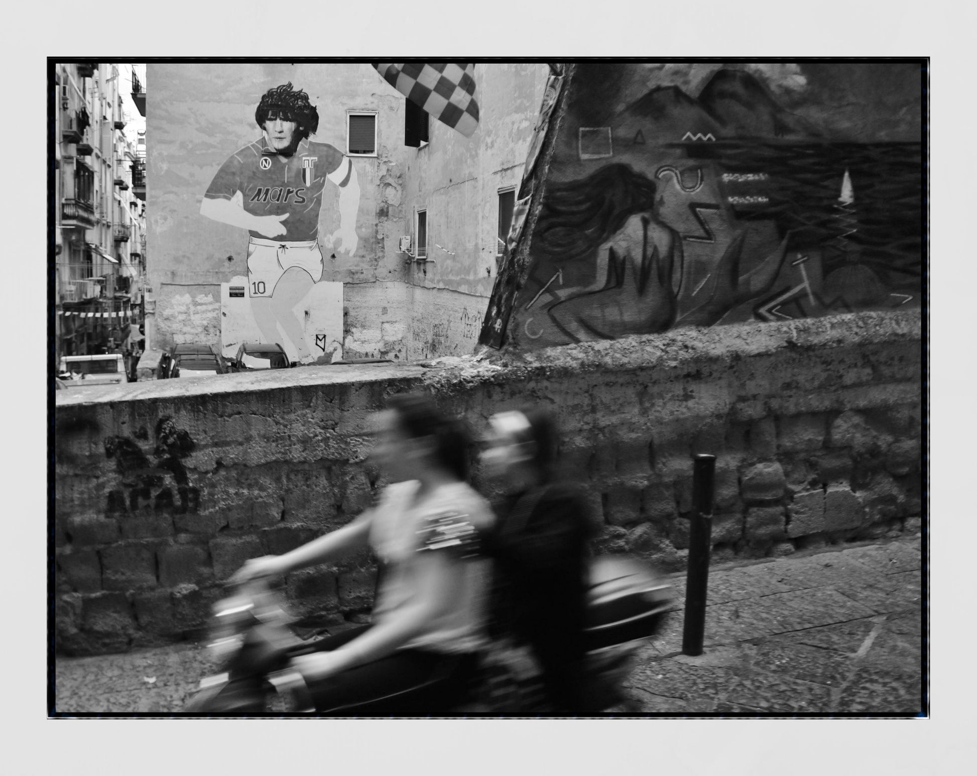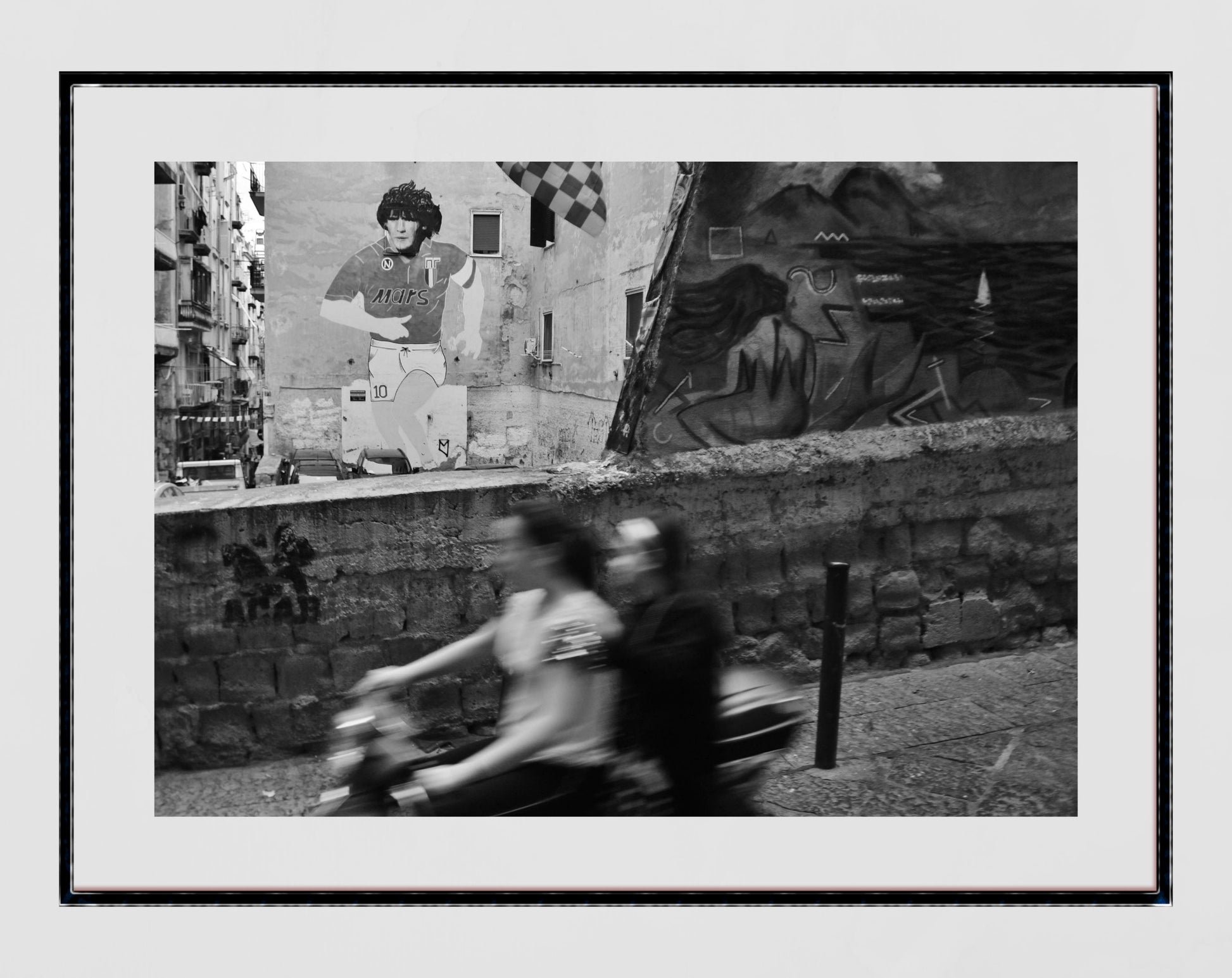This photography print of a Maradona mural in the Spanish Quarter of Naples displays an image of him when he played for Napoli wearing the iconic Mars strip. In the forefront of the poster are two girls zooming past on a moped - the archetypal Naples method of transport.