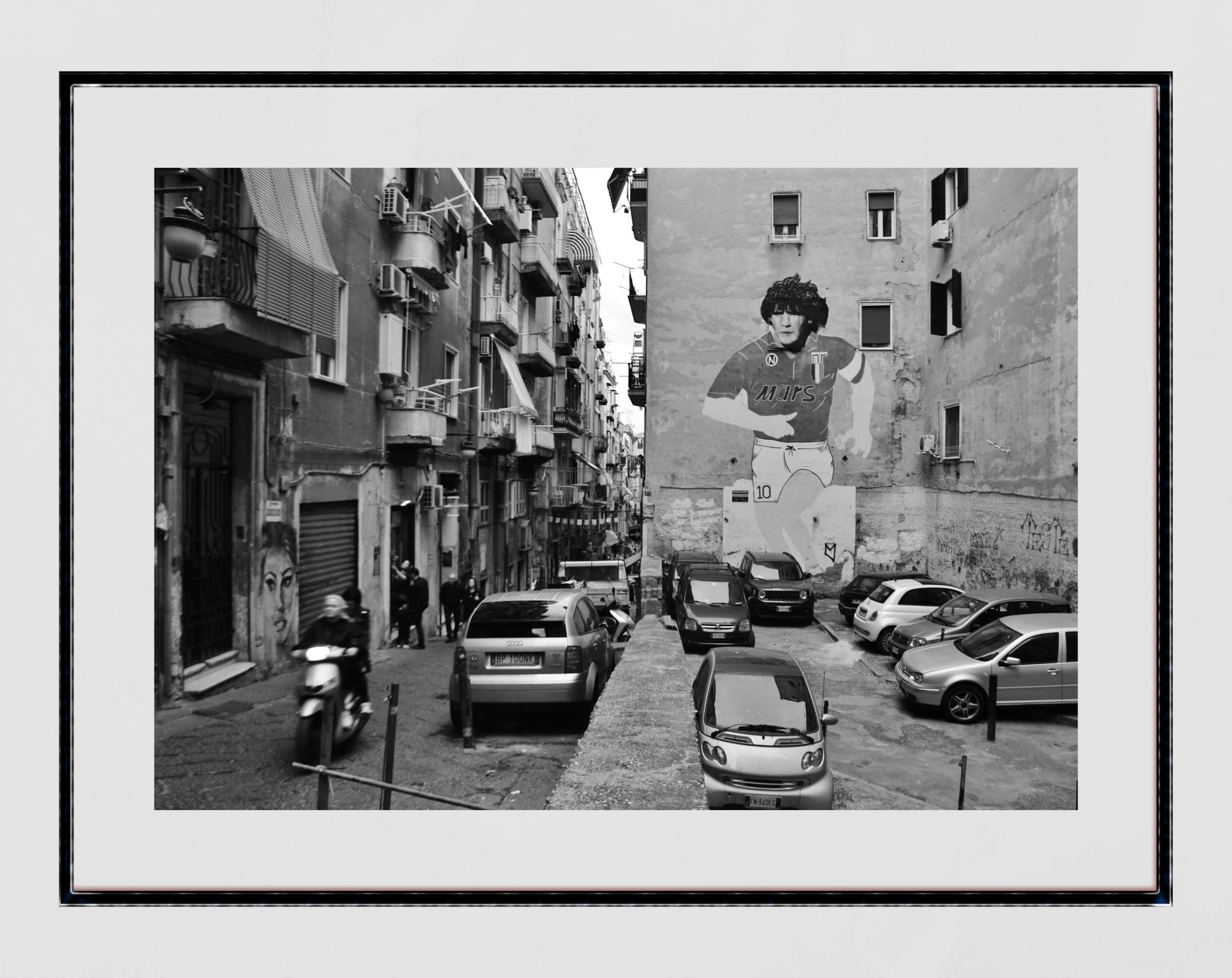 This black and white photography print of a Maradona mural in the Spanish Quarter of Naples displays an image of him when he played for Napoli wearing the iconic Mars strip. To the left is a moped whizzing past - the standard method of transport in Naples.