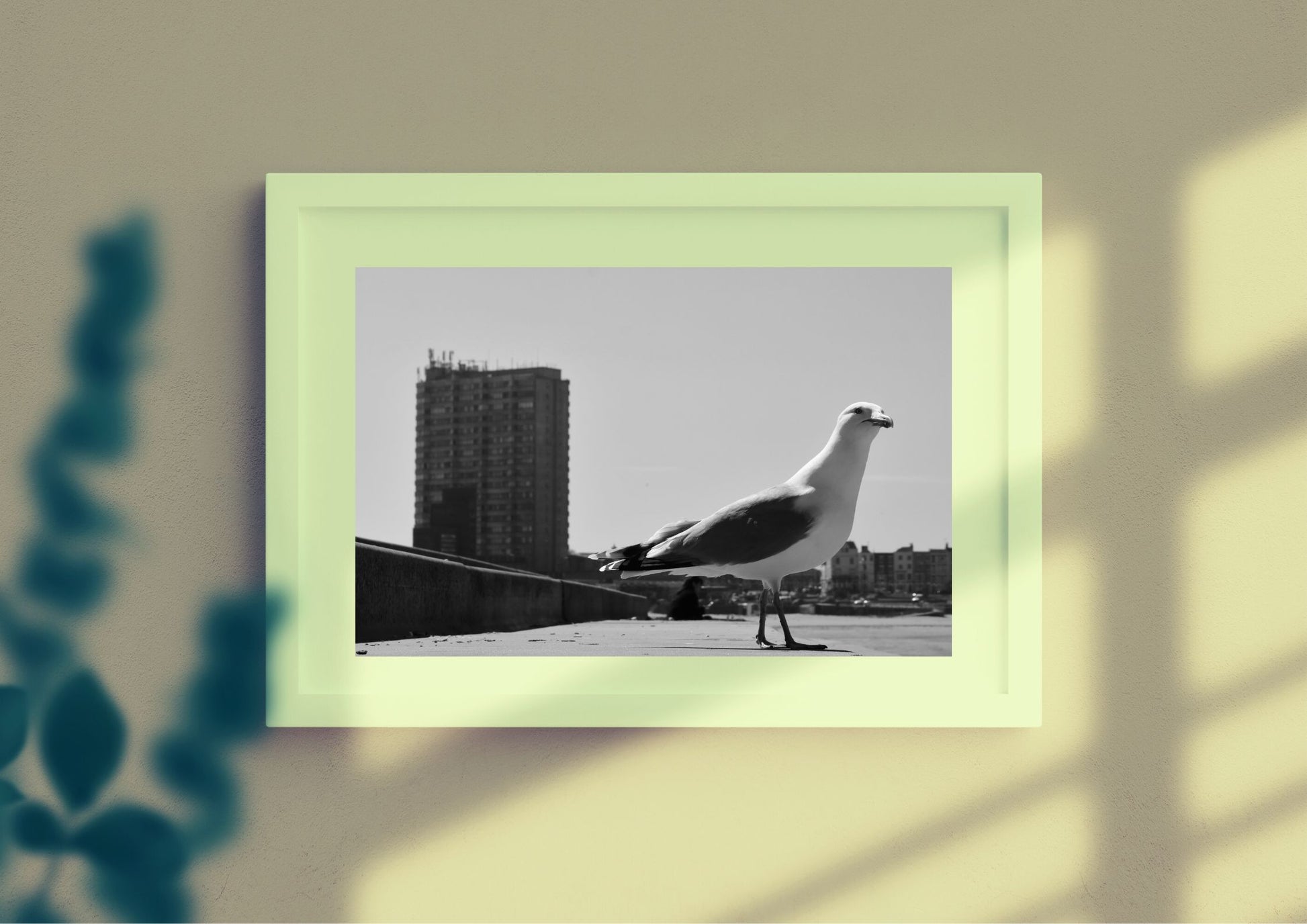 Margate is one of the UK's most iconic seaside towns. Formally a destination for British holiday-makers drawn by the funfair rides and sweet sticky rock, it has morphed into a destination of cutting edge cool, home to contemporary art galleries and rock-star owned hotels. This black and white photography print shows a ubiquitous presence at the British seaside, a seagull, with a stark Brutalist building behind.
