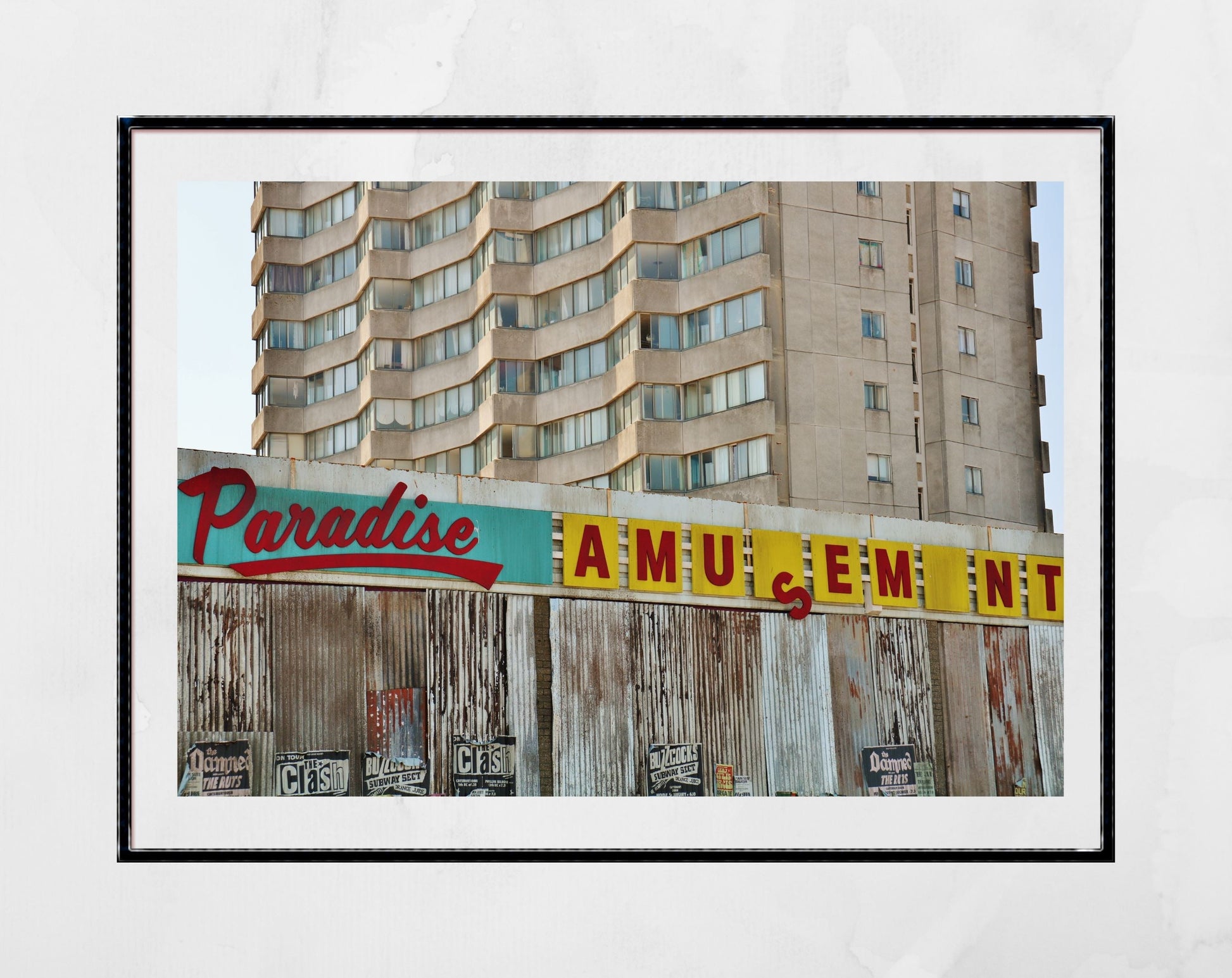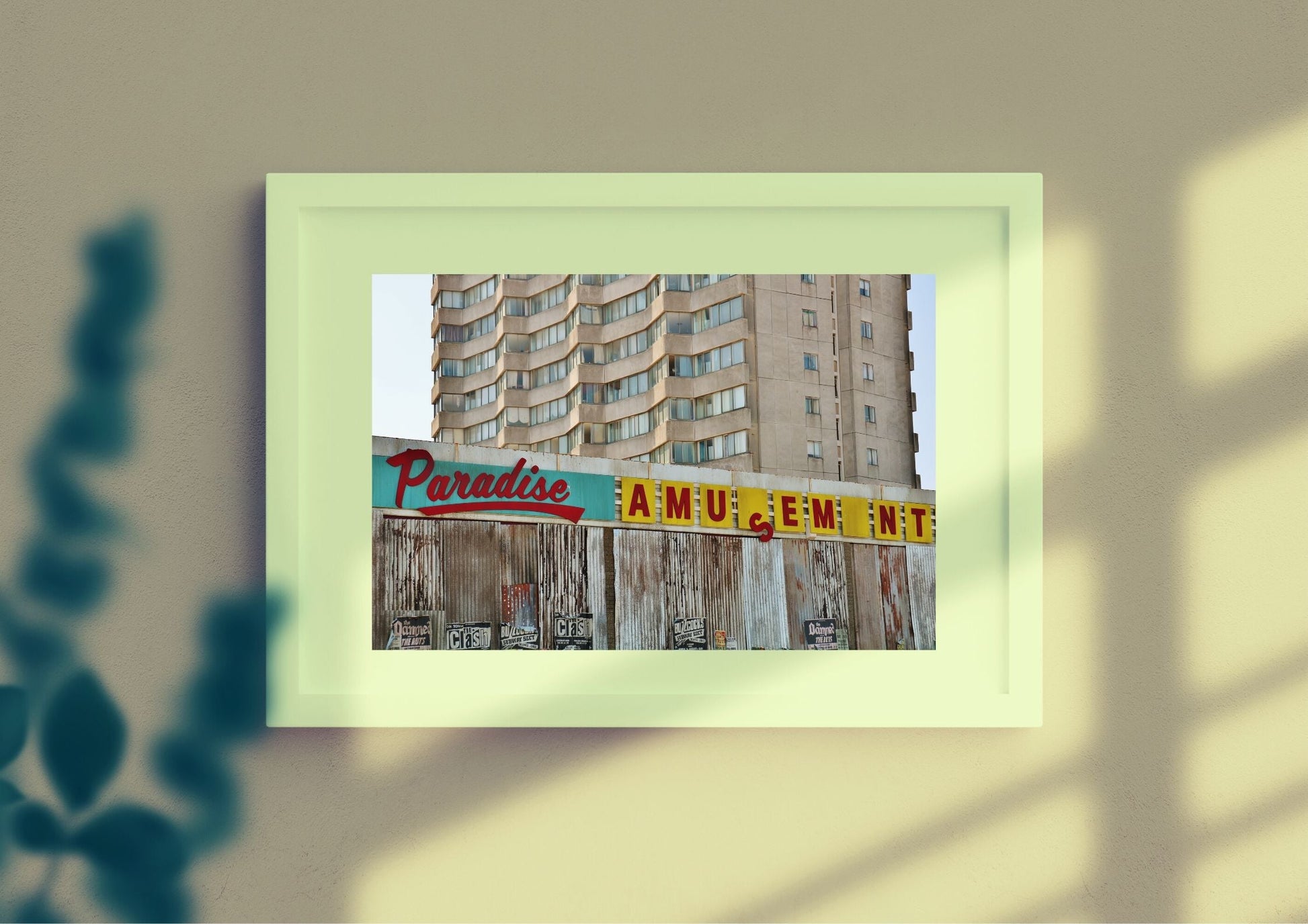 Margate is one of the UK's most iconic seaside towns. Formally a destination for British holiday-makers drawn by the funfair rides and sweet sticky rock, it has morphed into a destination of cutting edge cool, home to contemporary art galleries and rock-star owned hotels. This photography print shows a glimpse of the Margate of old: a derelict sign for an amusement park with a brutalist building behind.