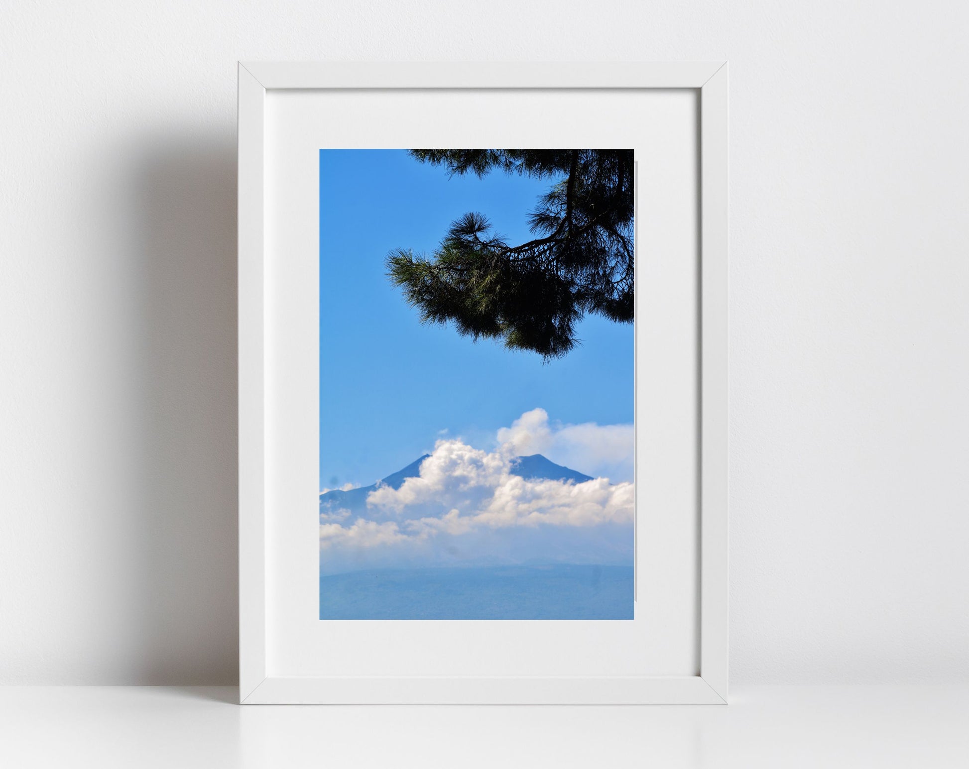 White fluffy clouds gather around Mount Etna, the active bubbling volcano that overlooks the east coast of Sicily. This view of Mount Etna, which is the largest volcano in Europe, was taken from Taormina.