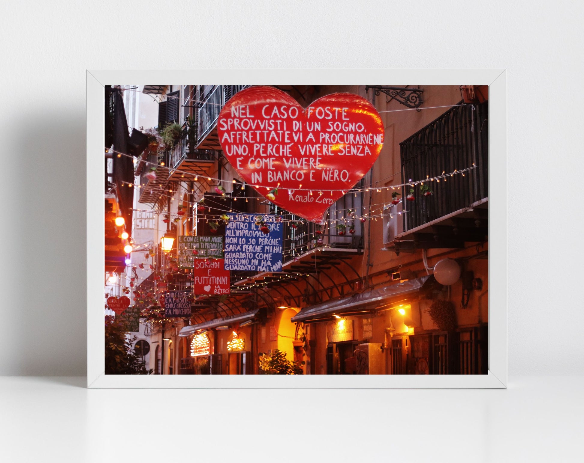 Messages of love adorned on hearts on a street in Palermo, Sicily.