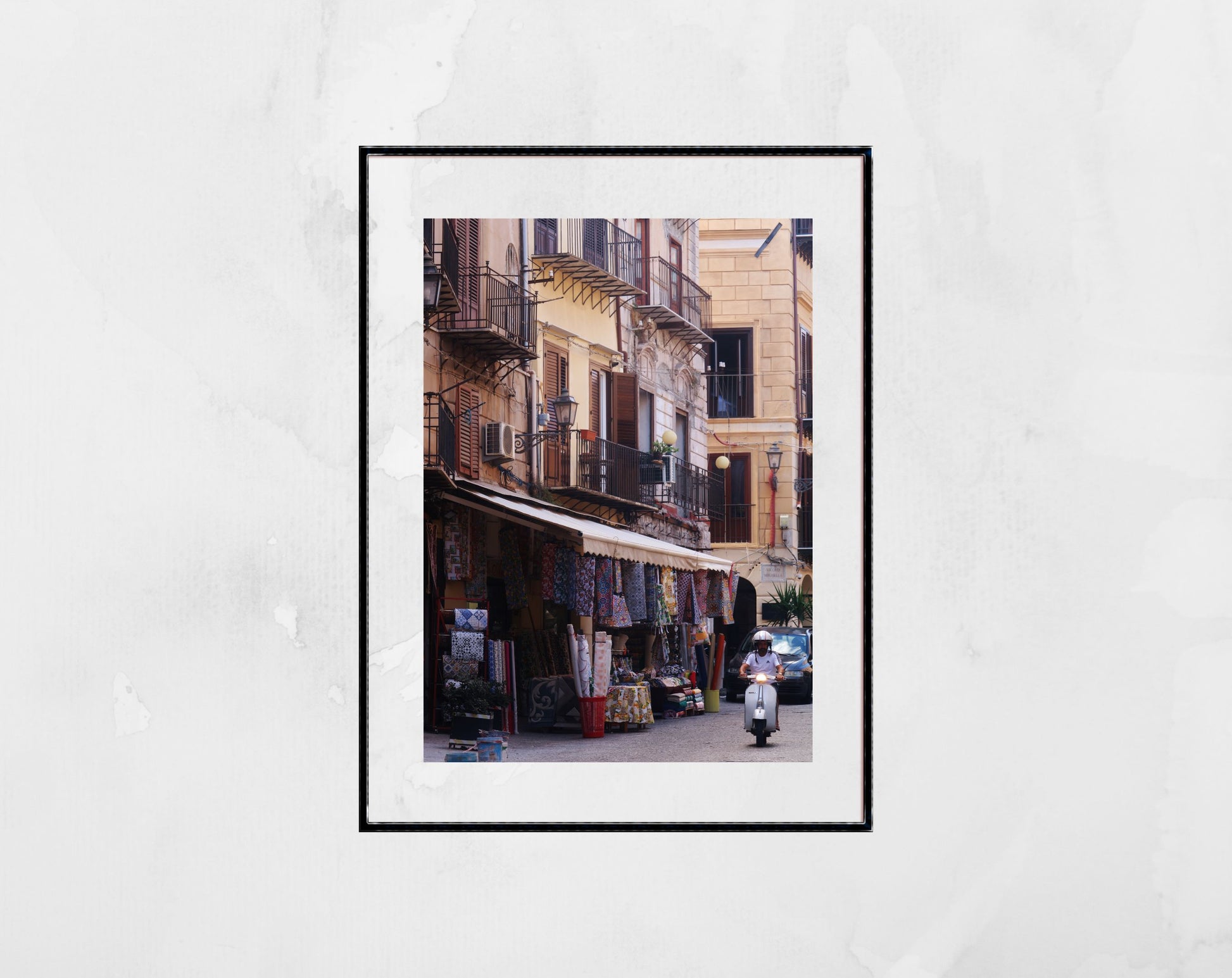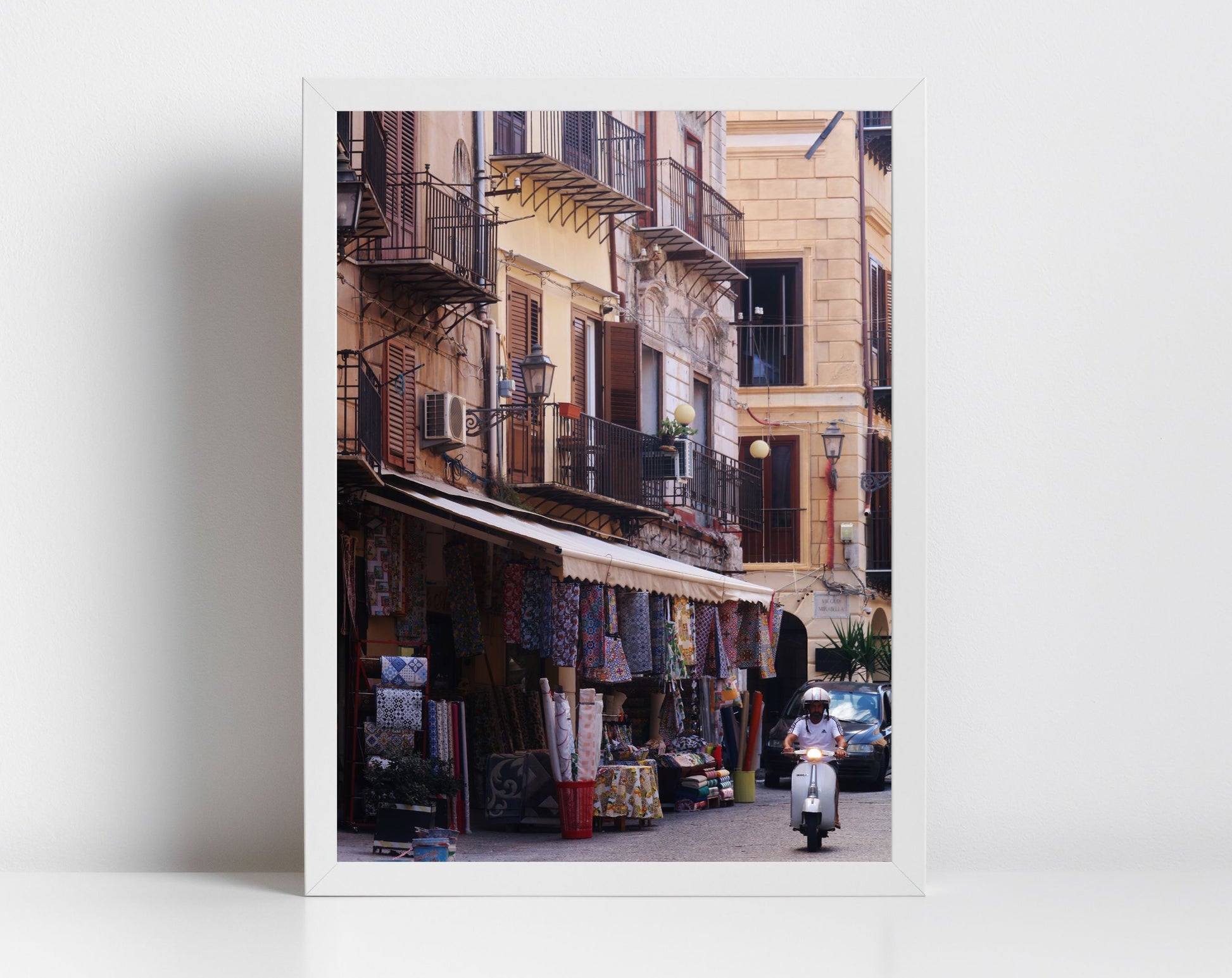 A Vespa zooms down the street of Sicily's Palermo past one of the city's many fabric stores.