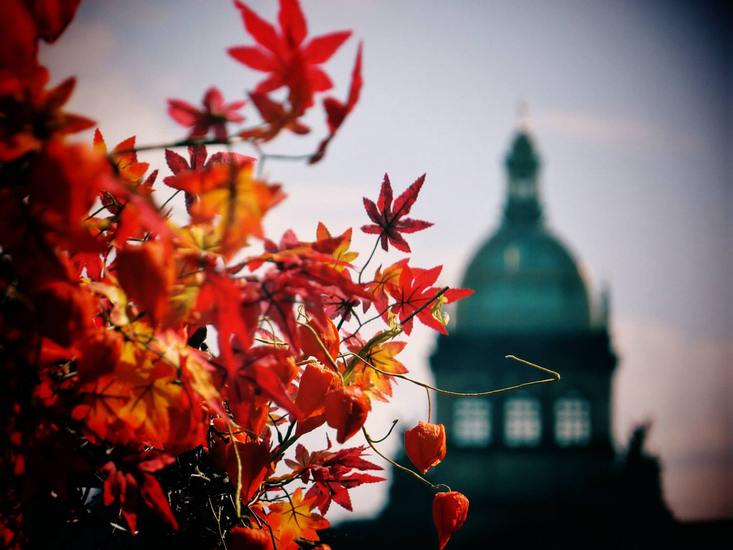 This photography print shows autumn leaves with Prague National Museum in the background. It is available in a variety of sizes, from small to extra large, and is striking displayed on its own or as part of a gallery wall.
