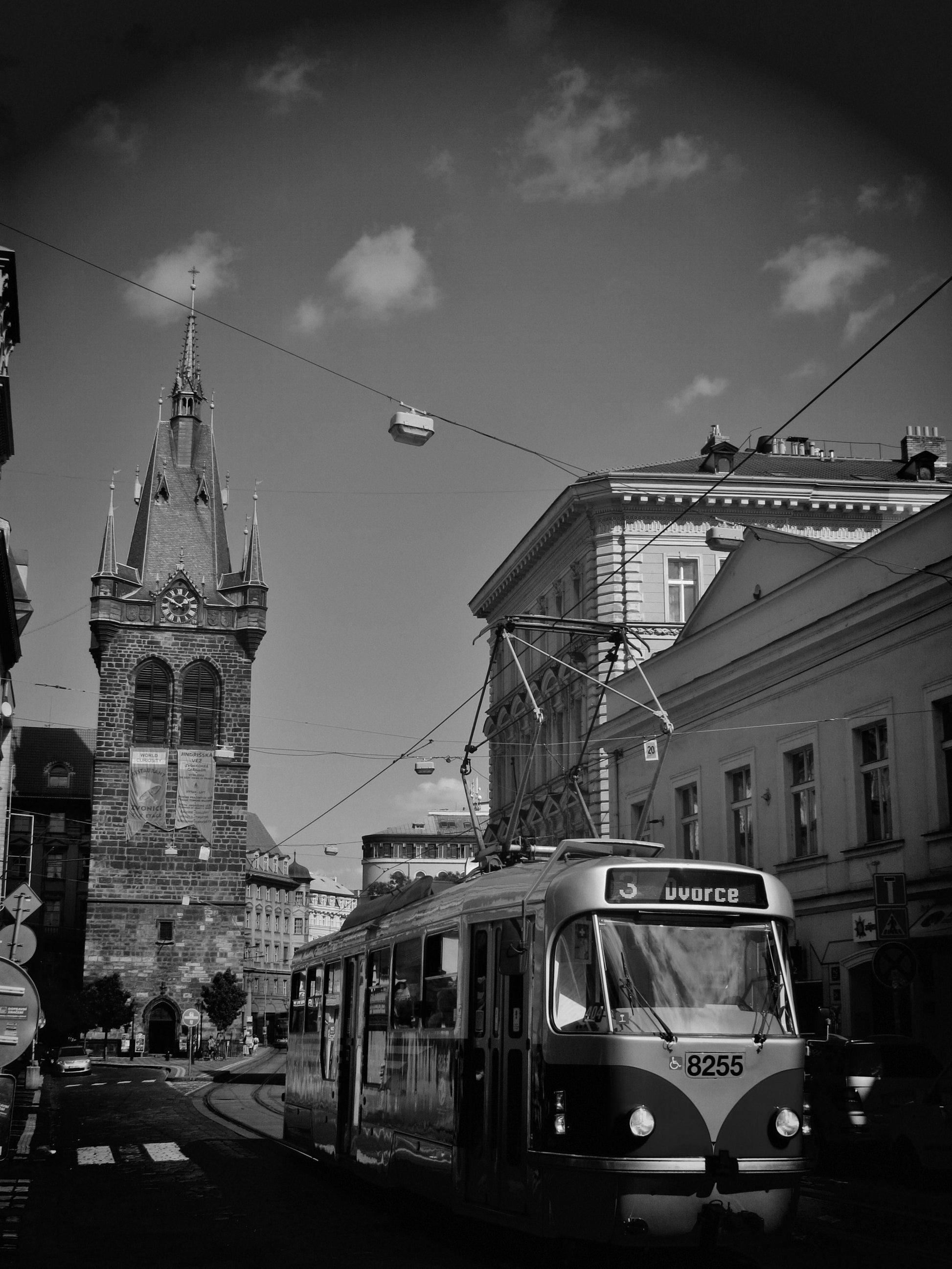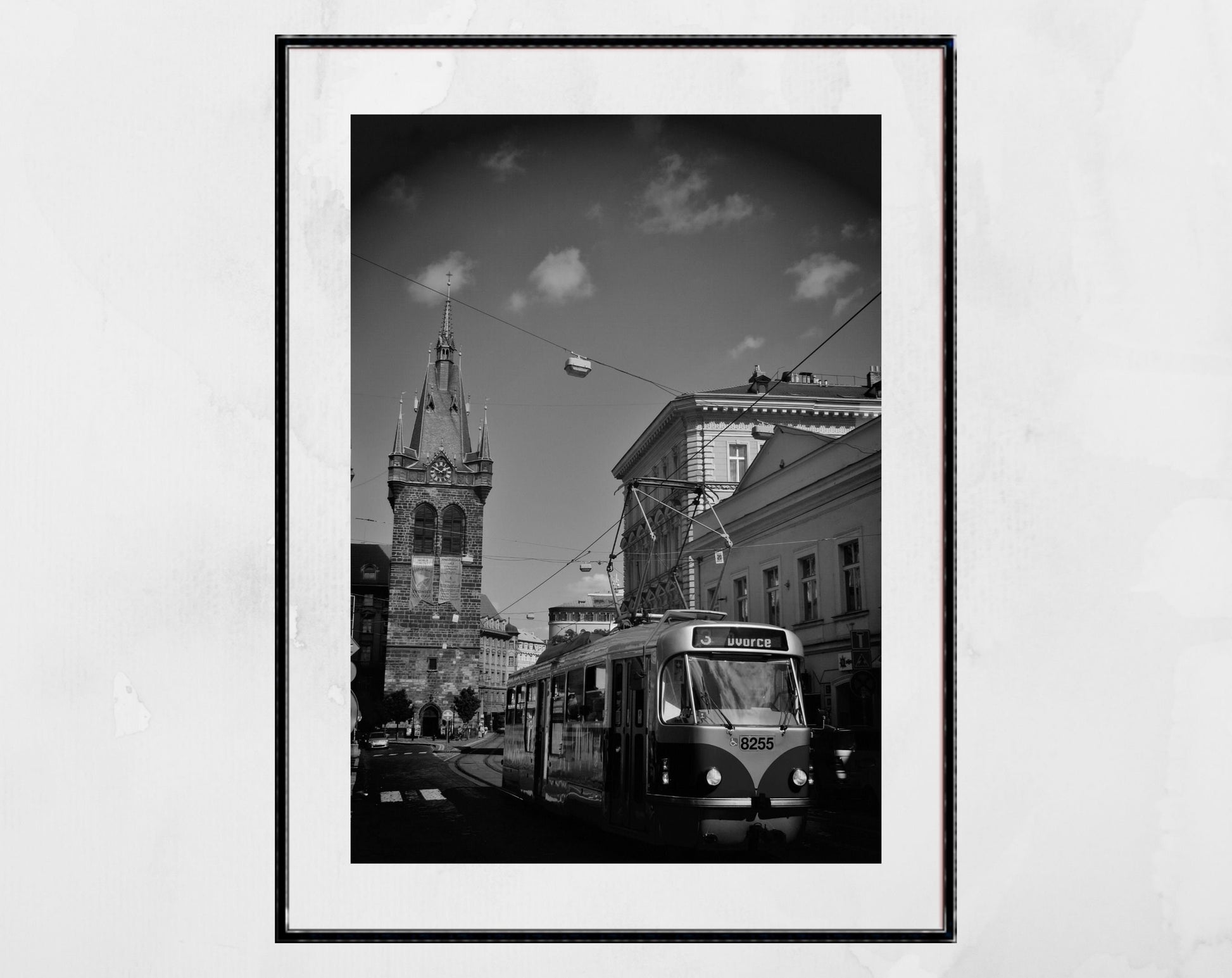 This black and white photography print shows a tram in Prague with the city's Powder tower behind. It is available in a variety of sizes, from small to extra large, and is striking displayed on its own or as part of a gallery wall.