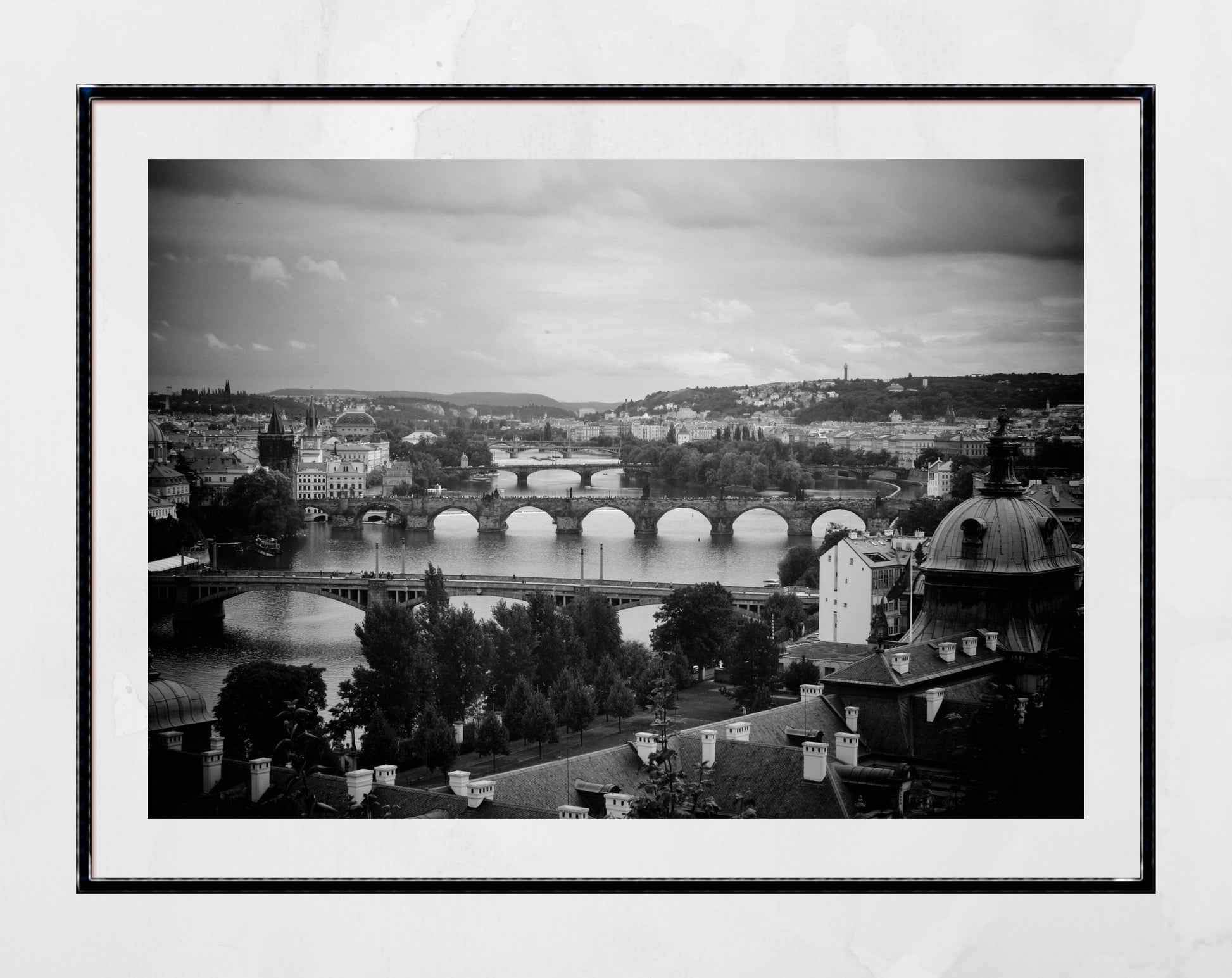 This black and white photography print shows Vltava River in Prague as taken from Letna Gardens. It is available in a variety of sizes, from small to extra large, and is striking displayed on its own or as part of a gallery wall.