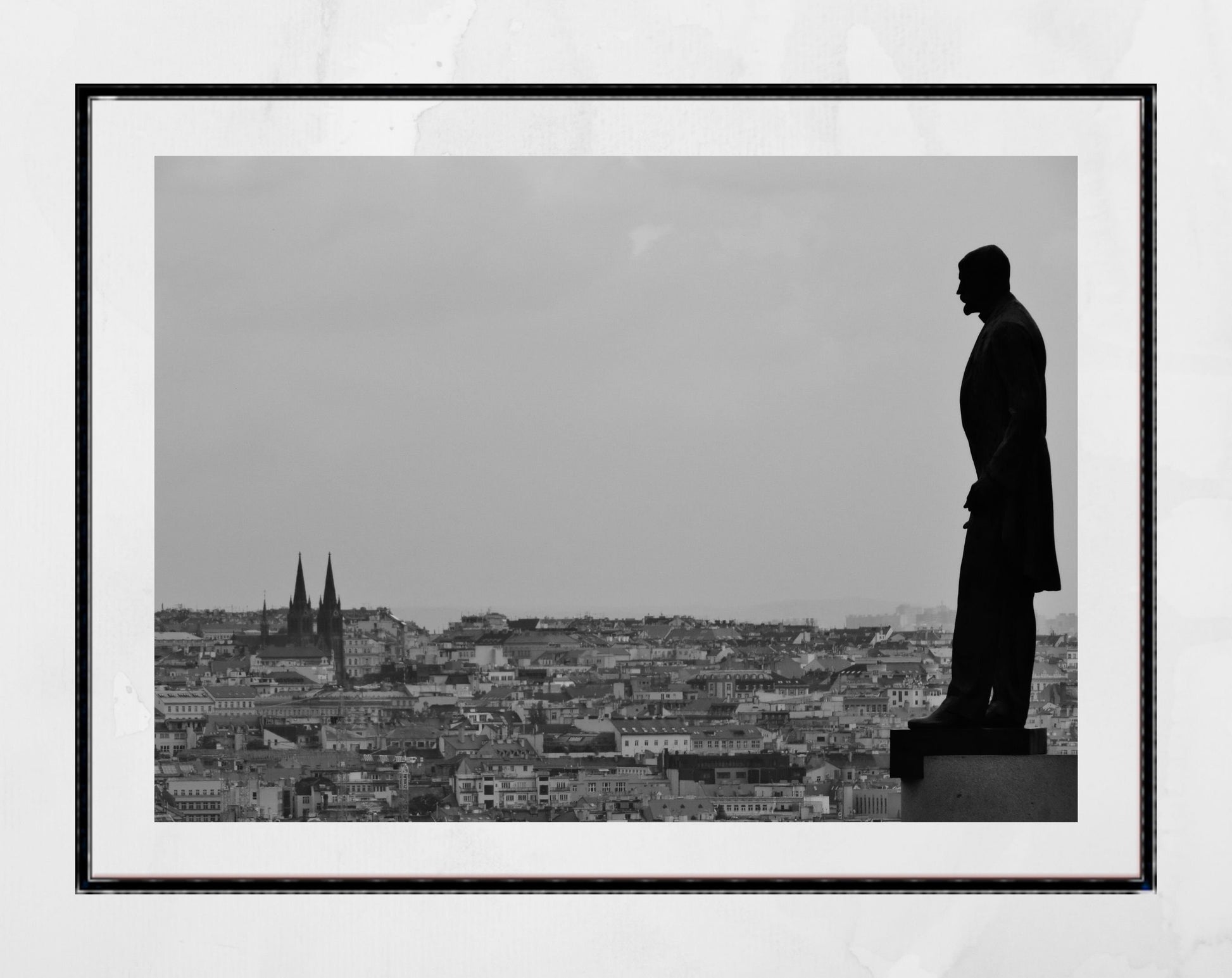 The black and white photography print shows the statue of Masaryk, the first President of Czechoslovakia overlooking Prague at Prague Castle. It is available in a variety of sizes, from small to extra large, and is striking displayed on its own or as part of a gallery wall.