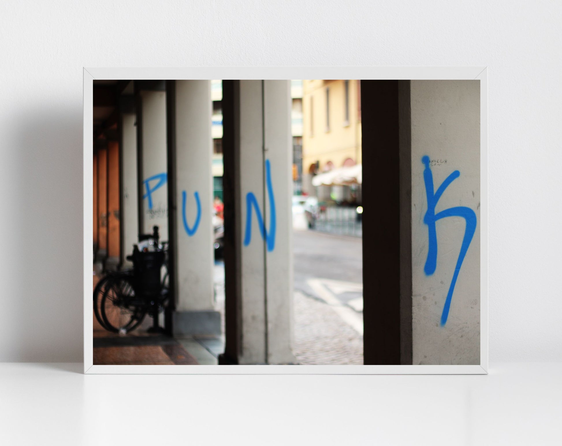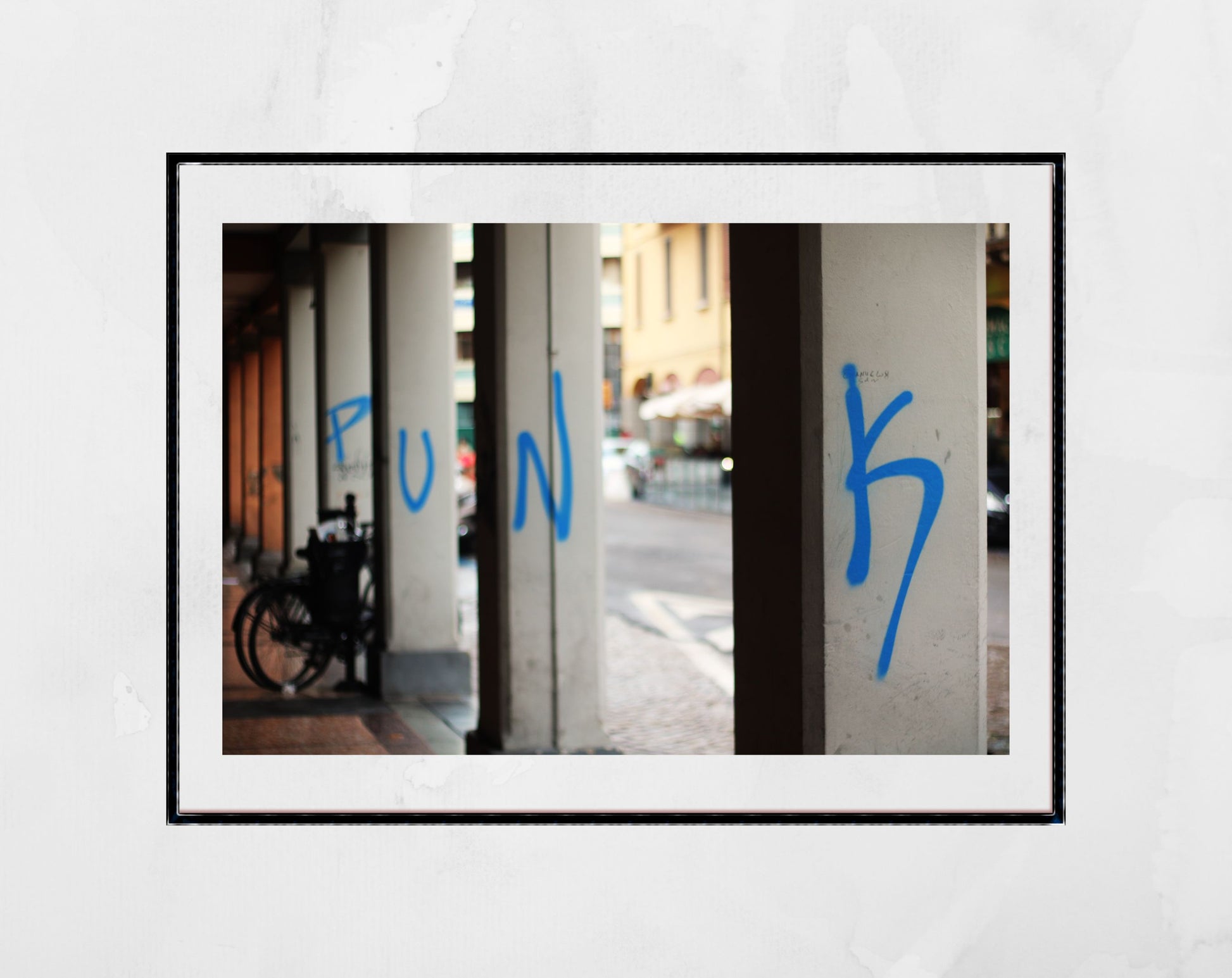 Bologna's porticos (columned covered walkways) are an emblem of the university student-filled, slightly rebellious Italian city. Many of them are used as canvases for graffiti scrawlers with a message to proclaim. While walked through the streets of Bologna during our time there in 2024 we got a kick out of seeing one opportunity street artist use four columns of the portico to get their perceived message of importance across - PUNK.