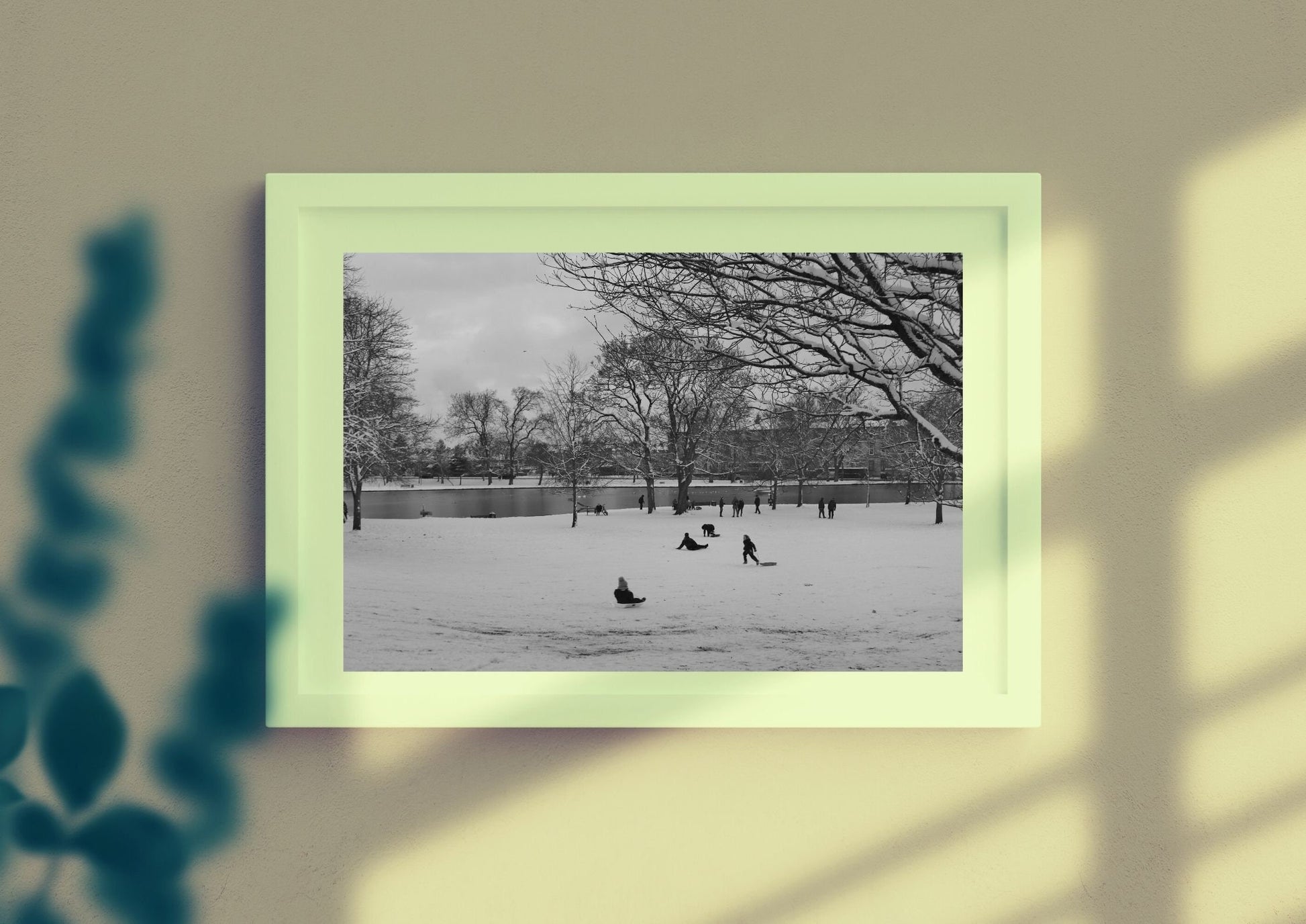 A winter scene in Queen's Park, Glasgow, with children sledging and snow dusting the pond and tenements behind.