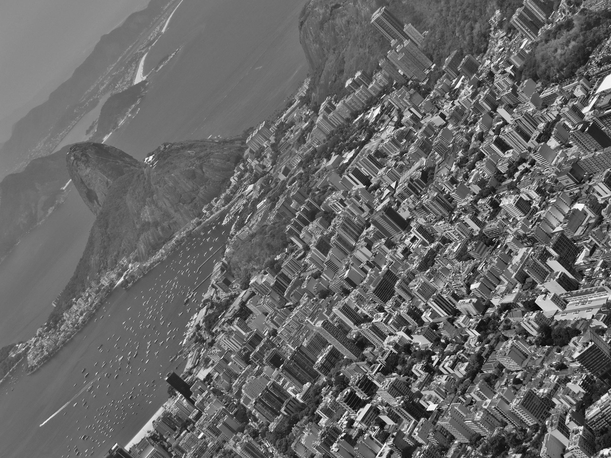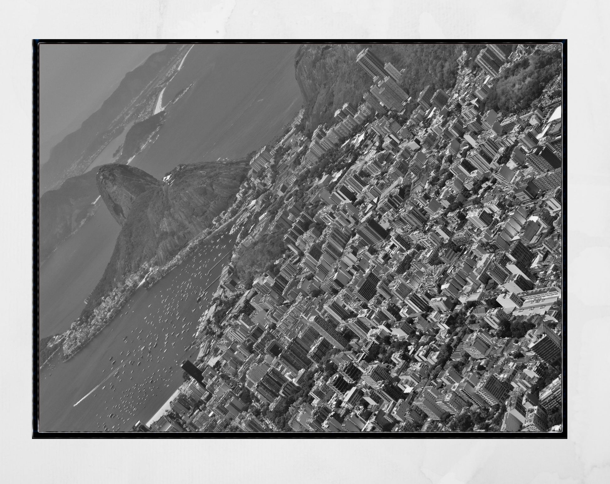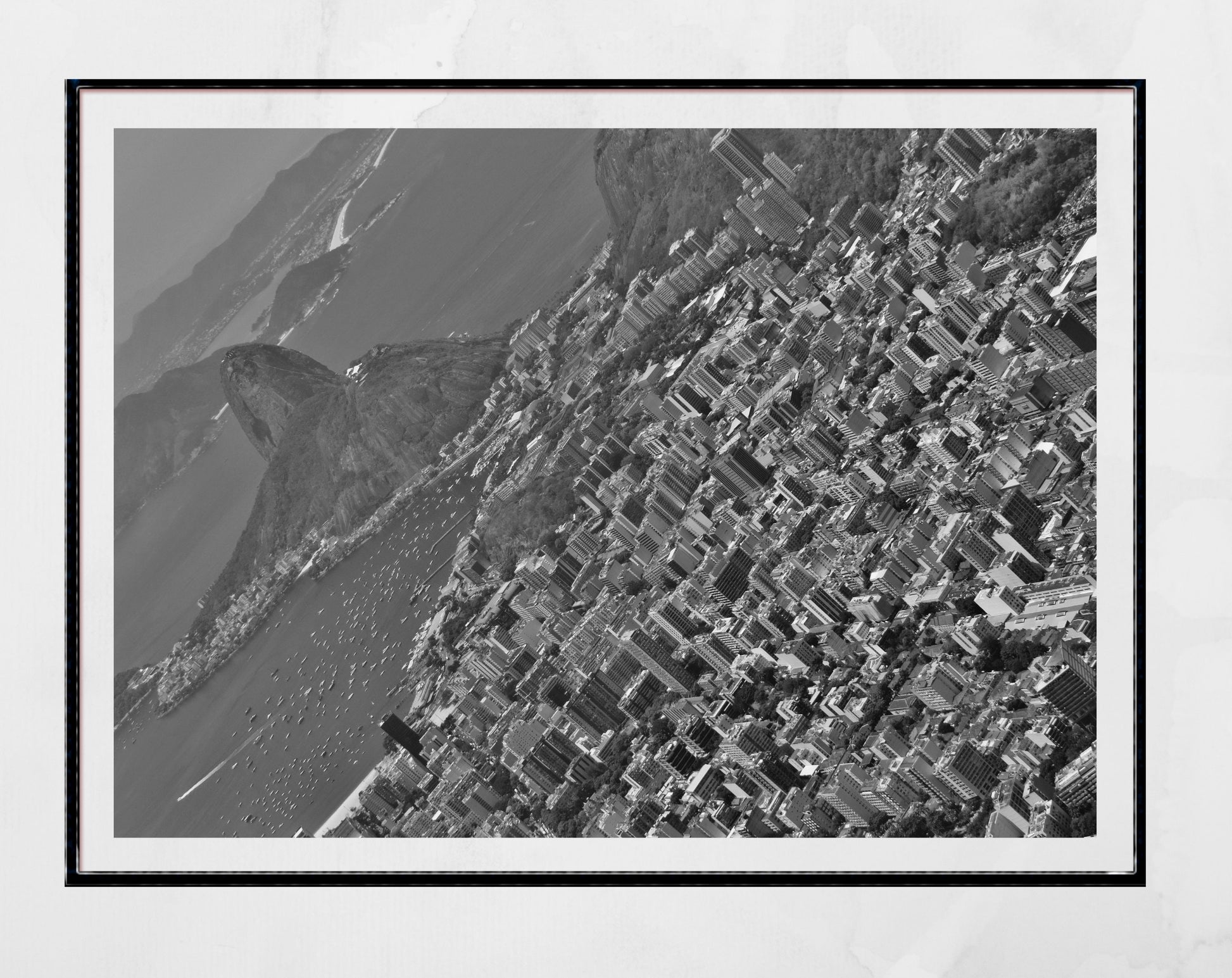 This black and white photography print shows a spectacular view of Rio De Janeiro taken from the Christ the Redeemer statue.