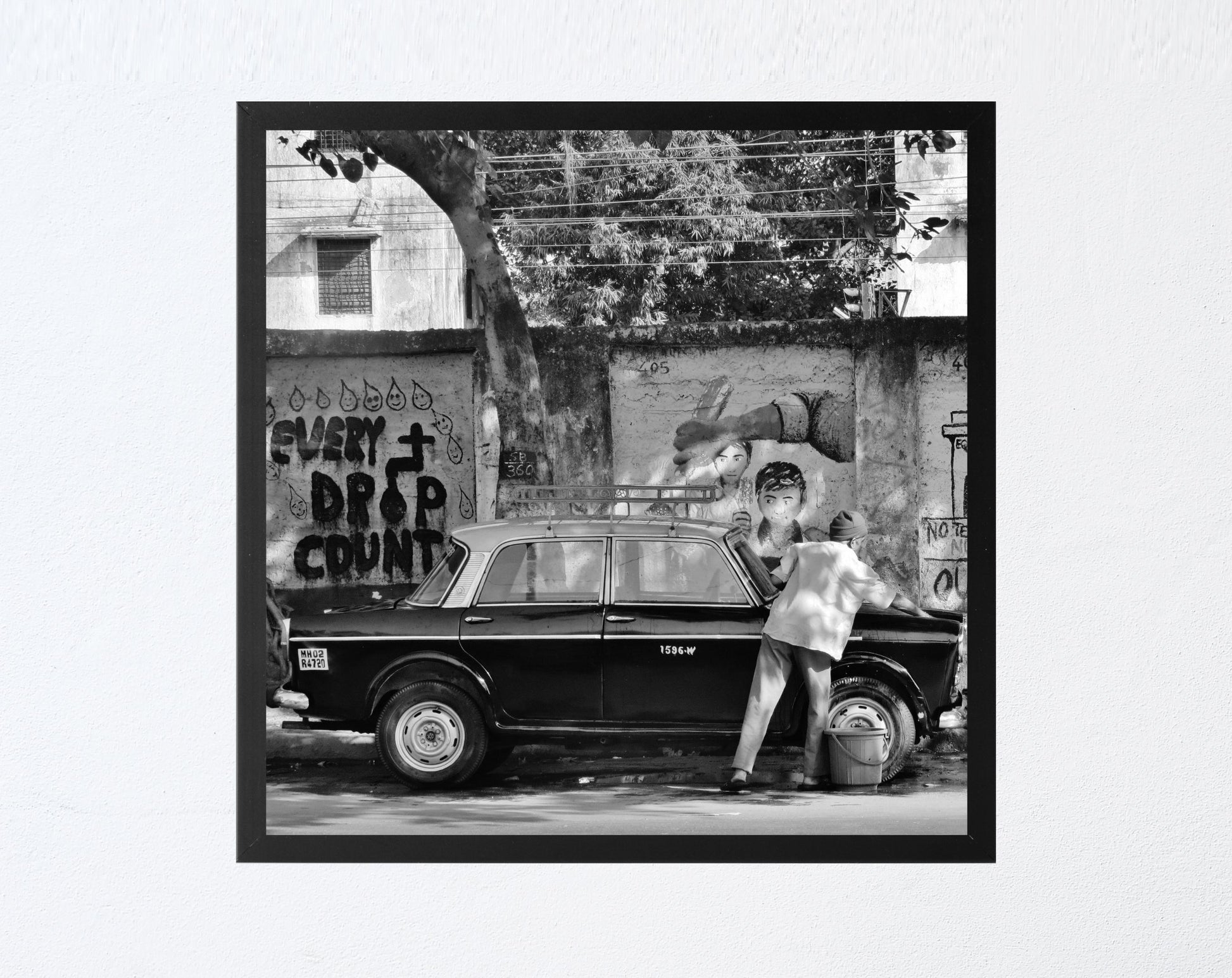 The Great Wall of Mumbai is where locals paint murals depicting their hopes, dreams, criticisms and frustrations. This black and white photography print shows a taxi driver washing his taxi in front of the wall.