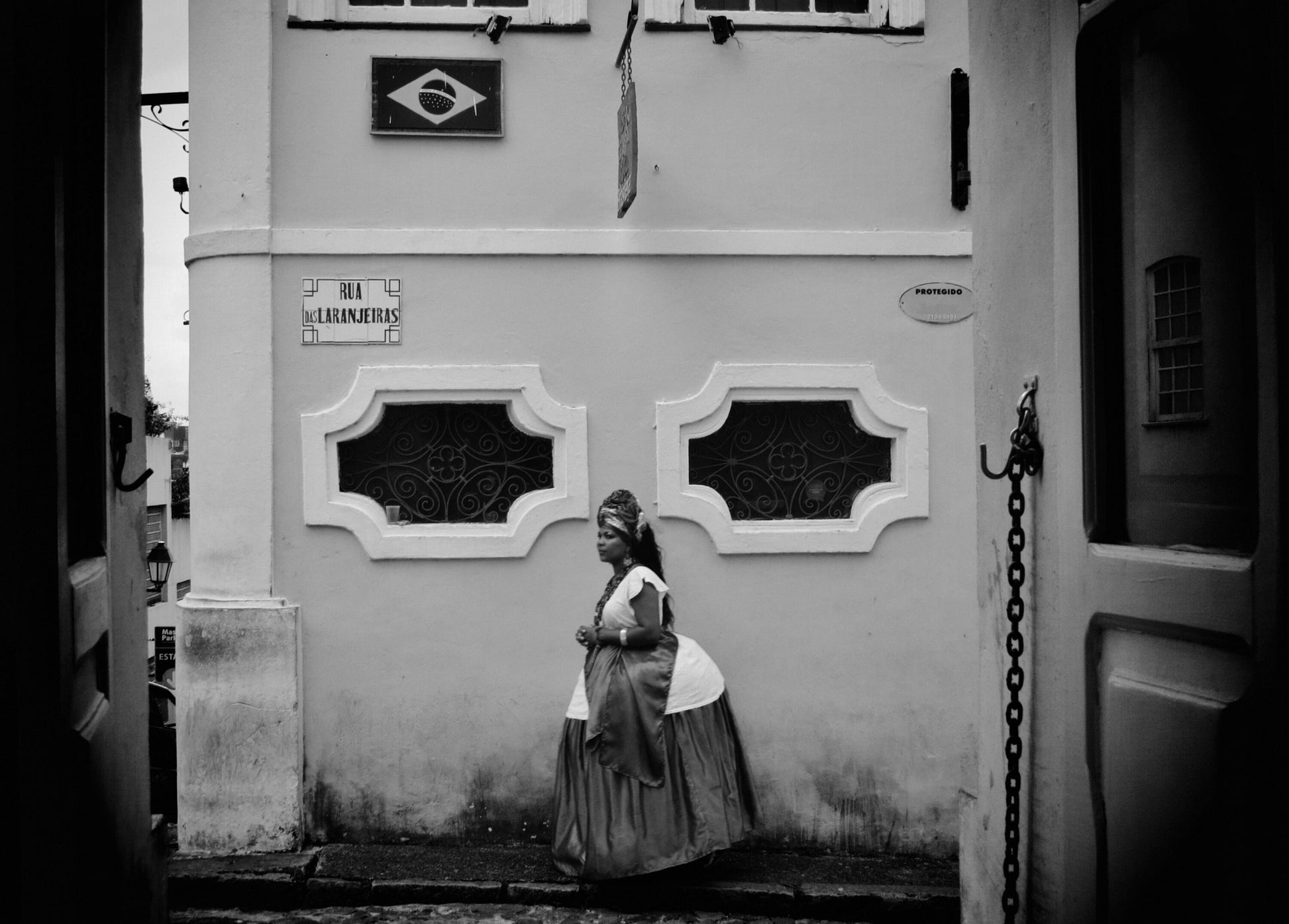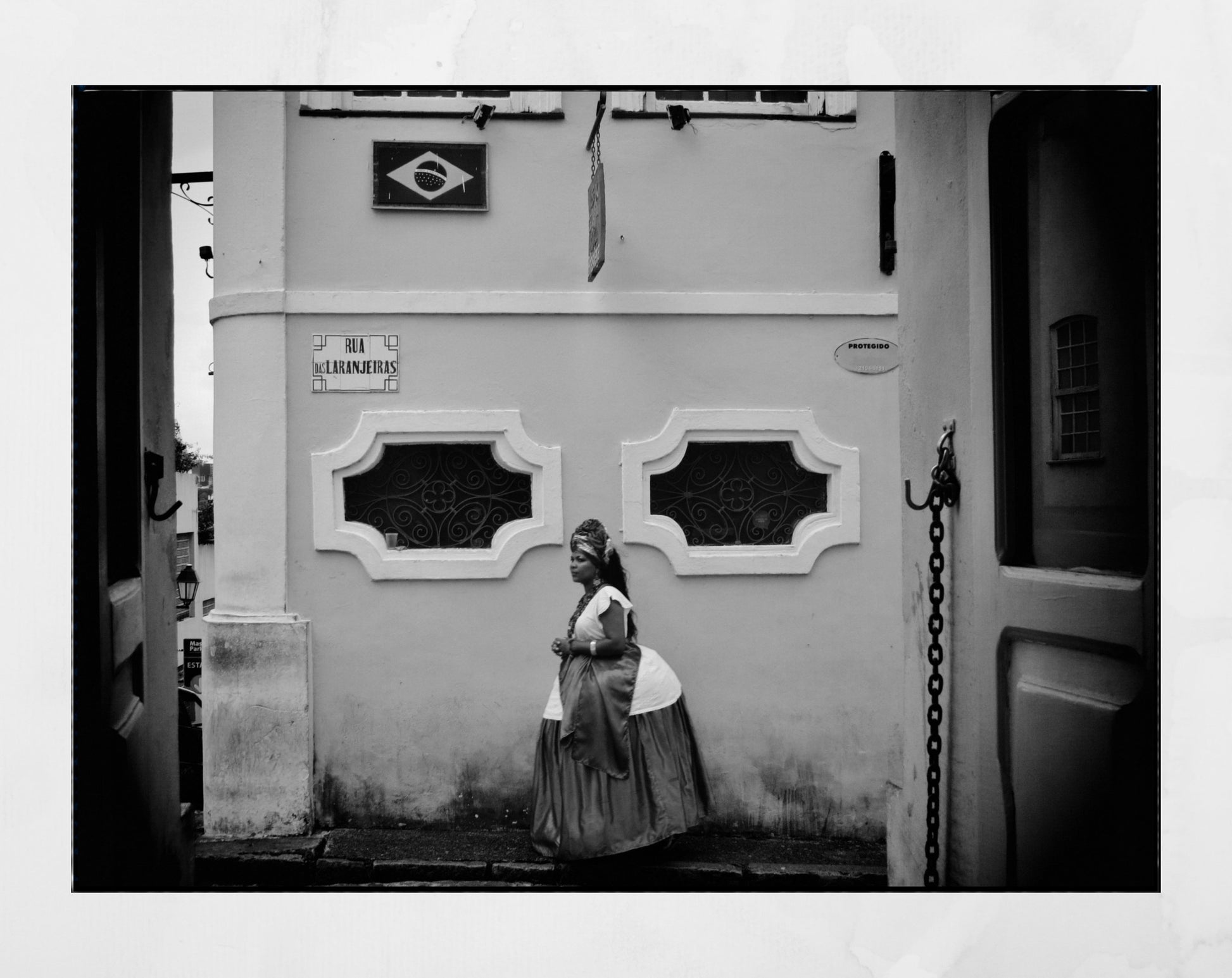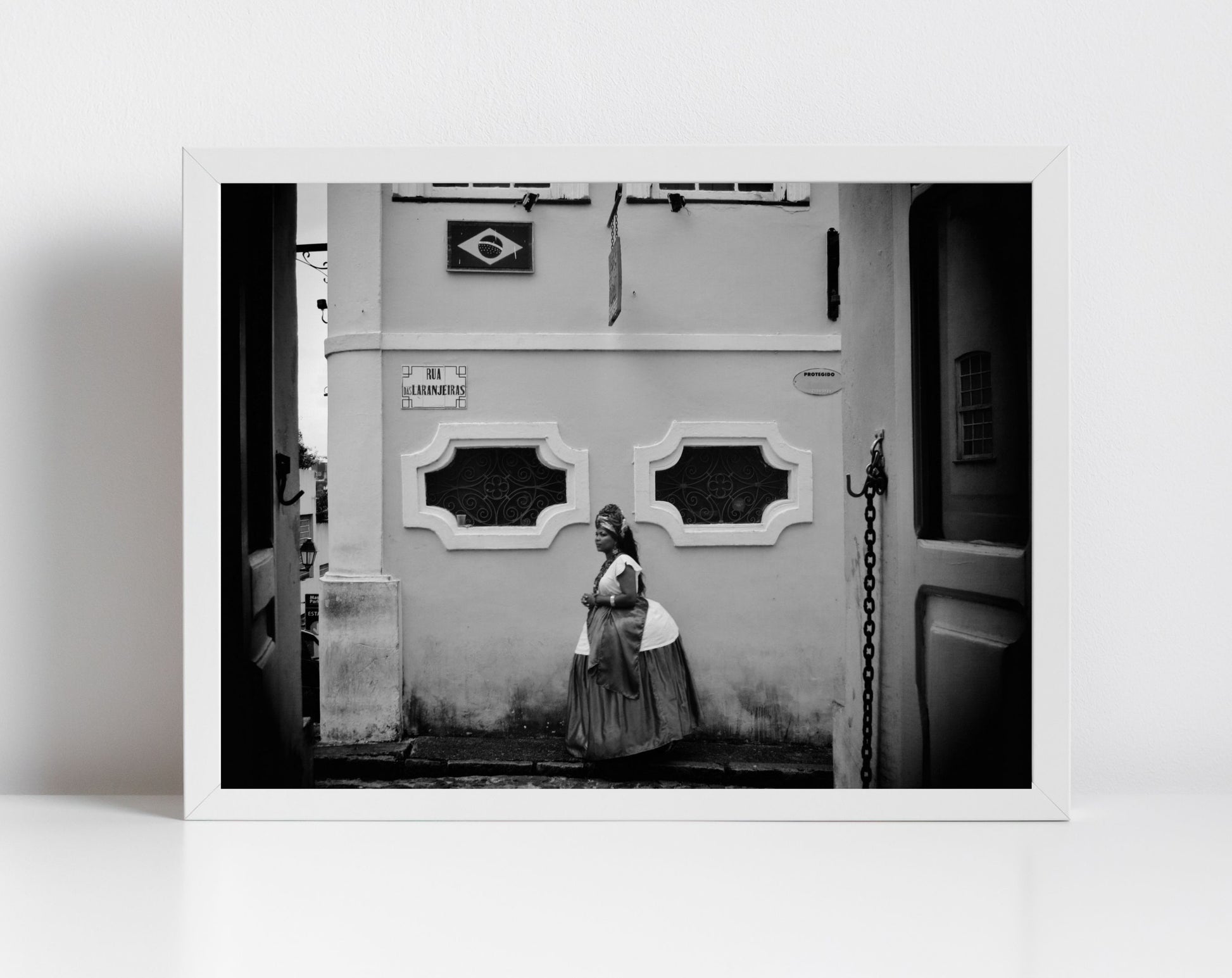 This photography print shows woman in a street of Salvador, Brazil wearing Baiana de Acarajé, the traditional dress of Salvador. It is available in a variety of sizes, from small to extra large, and is striking displayed on its own or as part of a gallery wall.