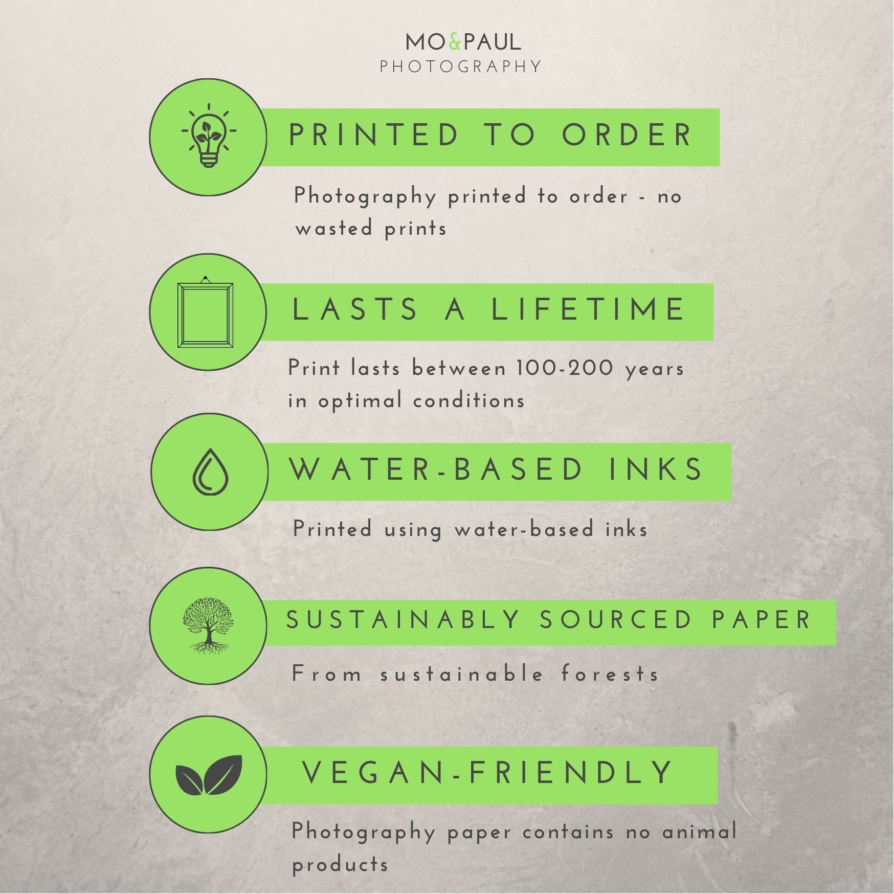 Our photography is printed at and posted from select photography labs in the UK and the USA on premium photography paper weighing 240gsm with a lustre finish. If you have any select paper requests please get in touch and we will try to accomodate.