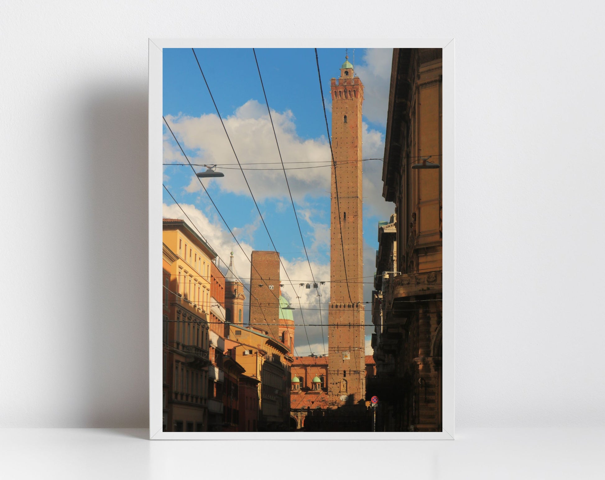 We captured this photograph of Bologna's iconic Towers while walking down the city's Via Rizzoli. The shadows fell below the towers, framing them in the afternoon light.