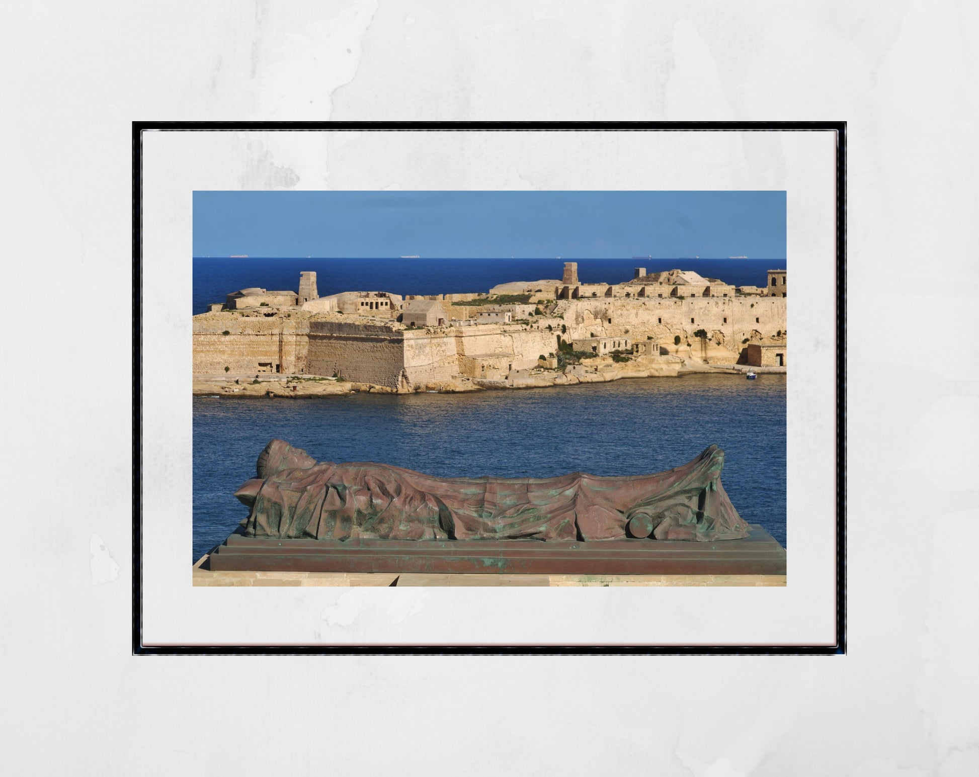 The statue of the Unknown Soldier in Valetta, Malta, with Fort Ricasoli behind. Malta was the most bombed location during the second world war and the statue, part of the Siege Bell Memorial, represents those who fought and died during the war. It was built in 1992 to commemorate the 50th anniversary of Malta being awarded the George Cross for its bravery during the war.Â