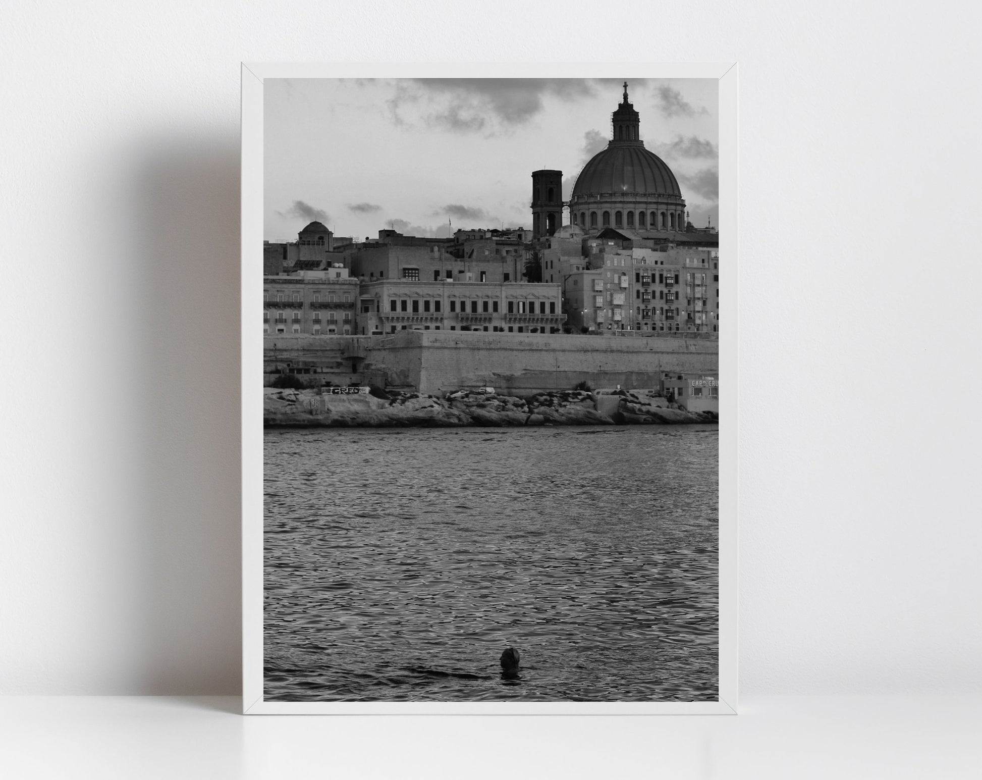A woman takes a dip in the Mediterranean Sea against the majestic skyline of Valletta, Malta's capital, at golden hour, just before sunset.