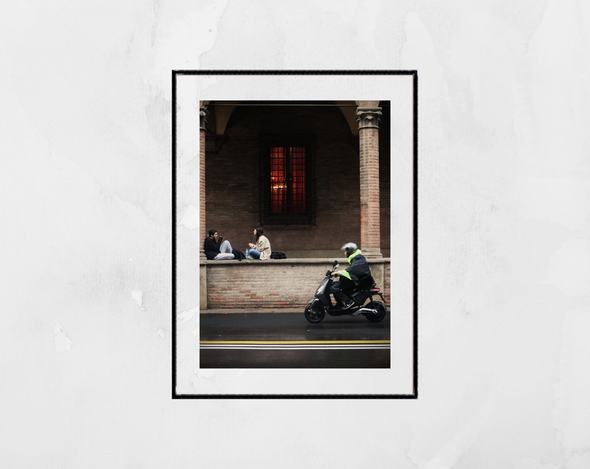Via Zamboni is the nucleus of the University of Bologna. We took this photograph of students gathered under its porticos as a moped sped past.
