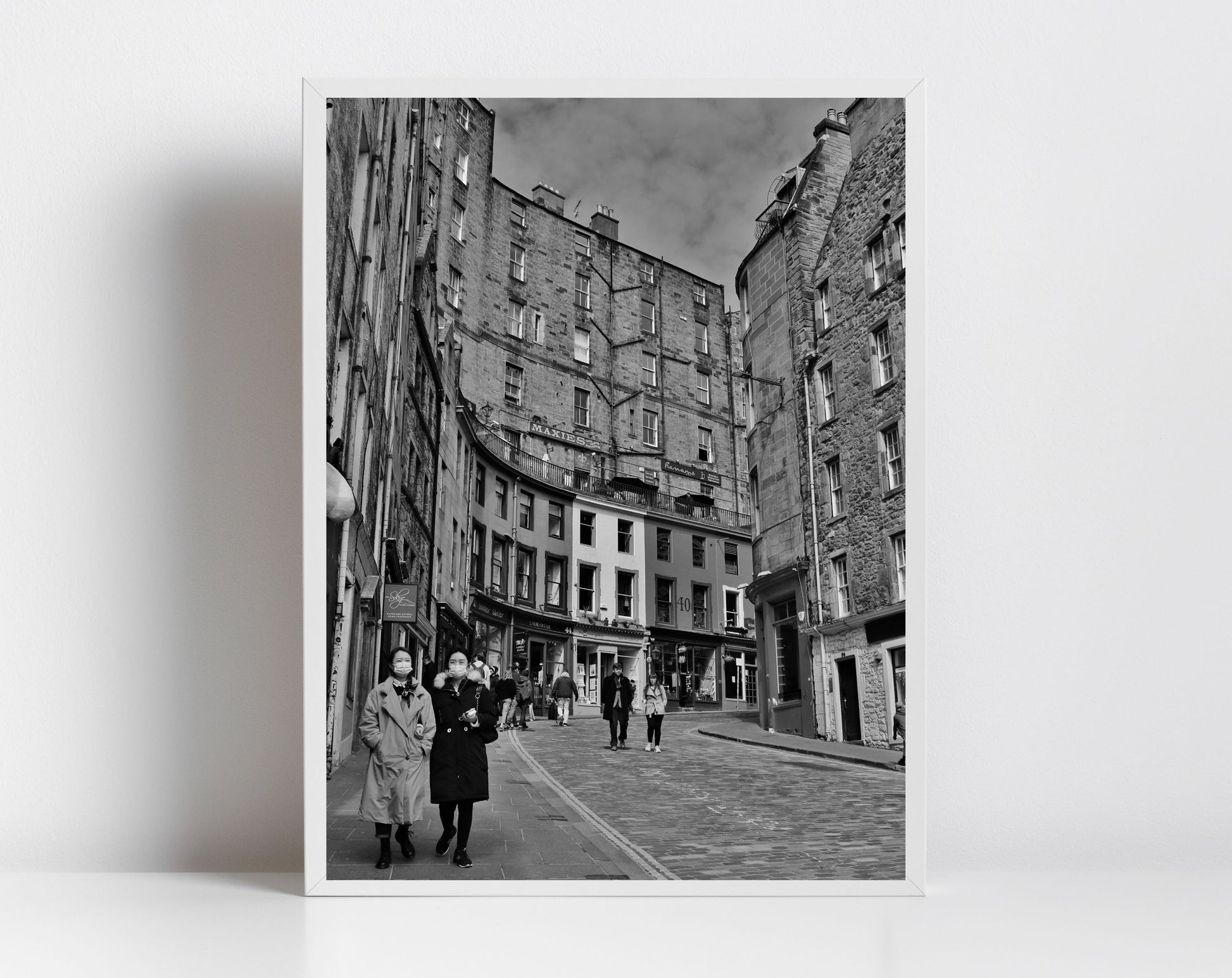 The brightly coloured shop fronts and cobbled road of the winding Victoria Street in Edinburgh's Old Town was J.K. Rowling's inspiration for Diagon Alley in the Harry Potter books - she wrote the first novel in Elephant Cafe at the top of the street. This photograph was taken in May 2021 when COVID still lingered and masks still commonly worn.