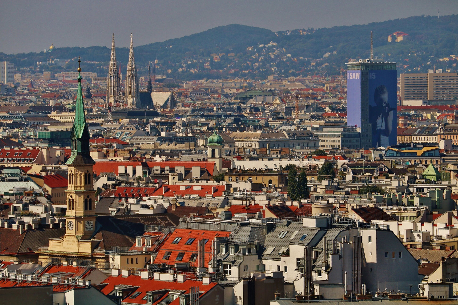 This photography print shows the city sprawl of Vienna, Austria. It is available in a variety of sizes, from small to extra large, and is striking displayed on its own or as part of a gallery wall.