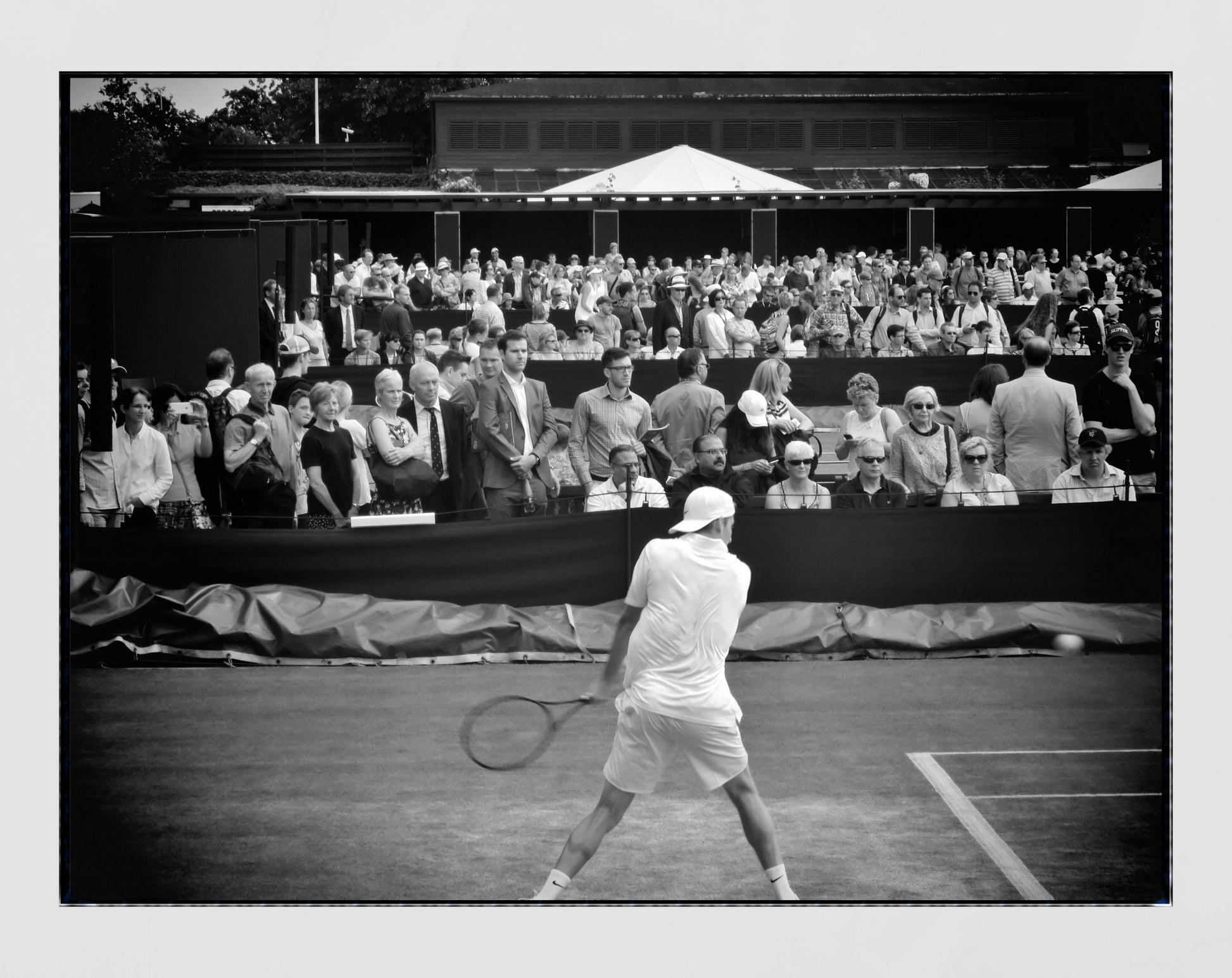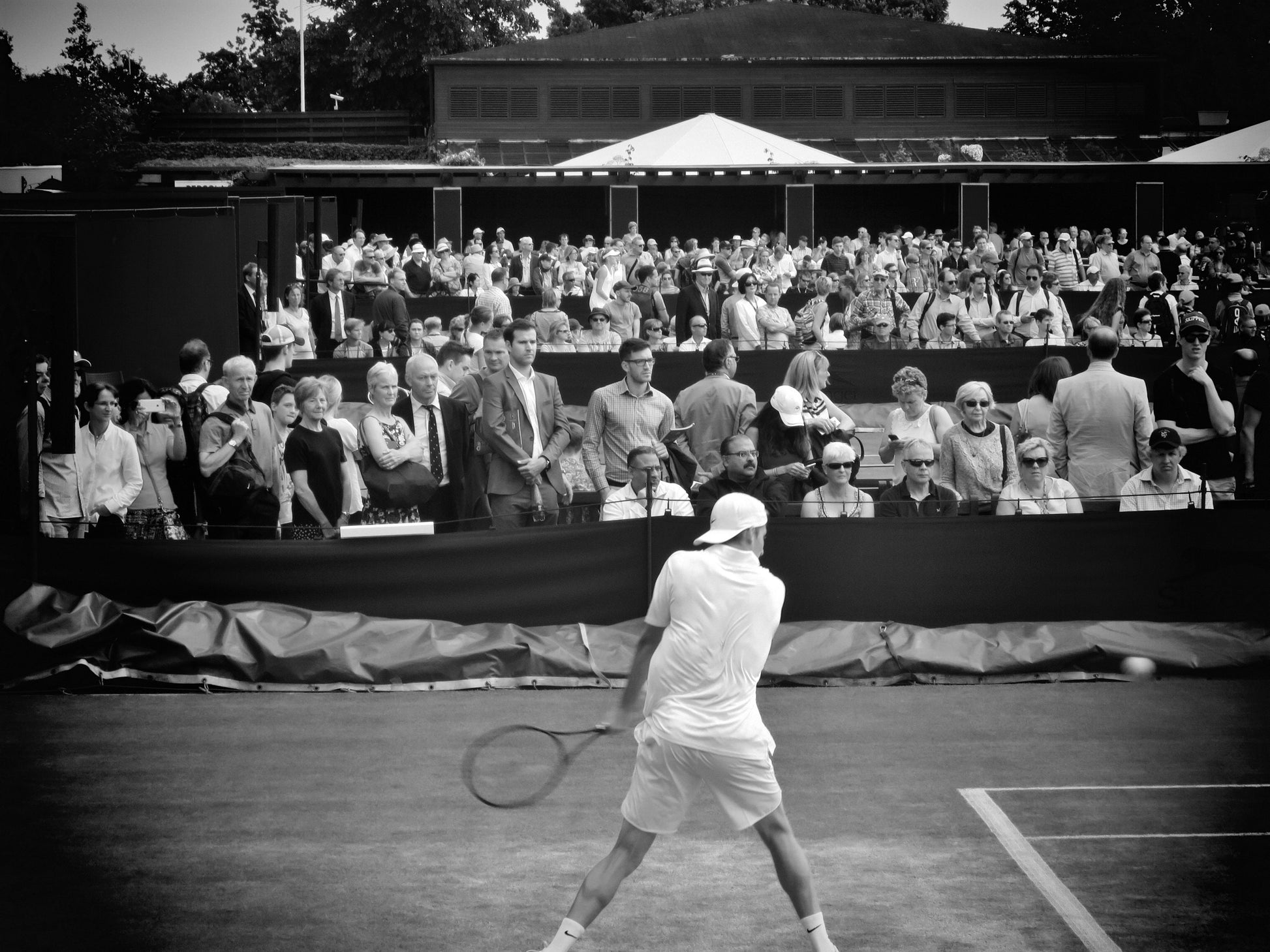 Bystanders watch the action at one of the smaller courts at the iconic Wimbledon Tennis Club.